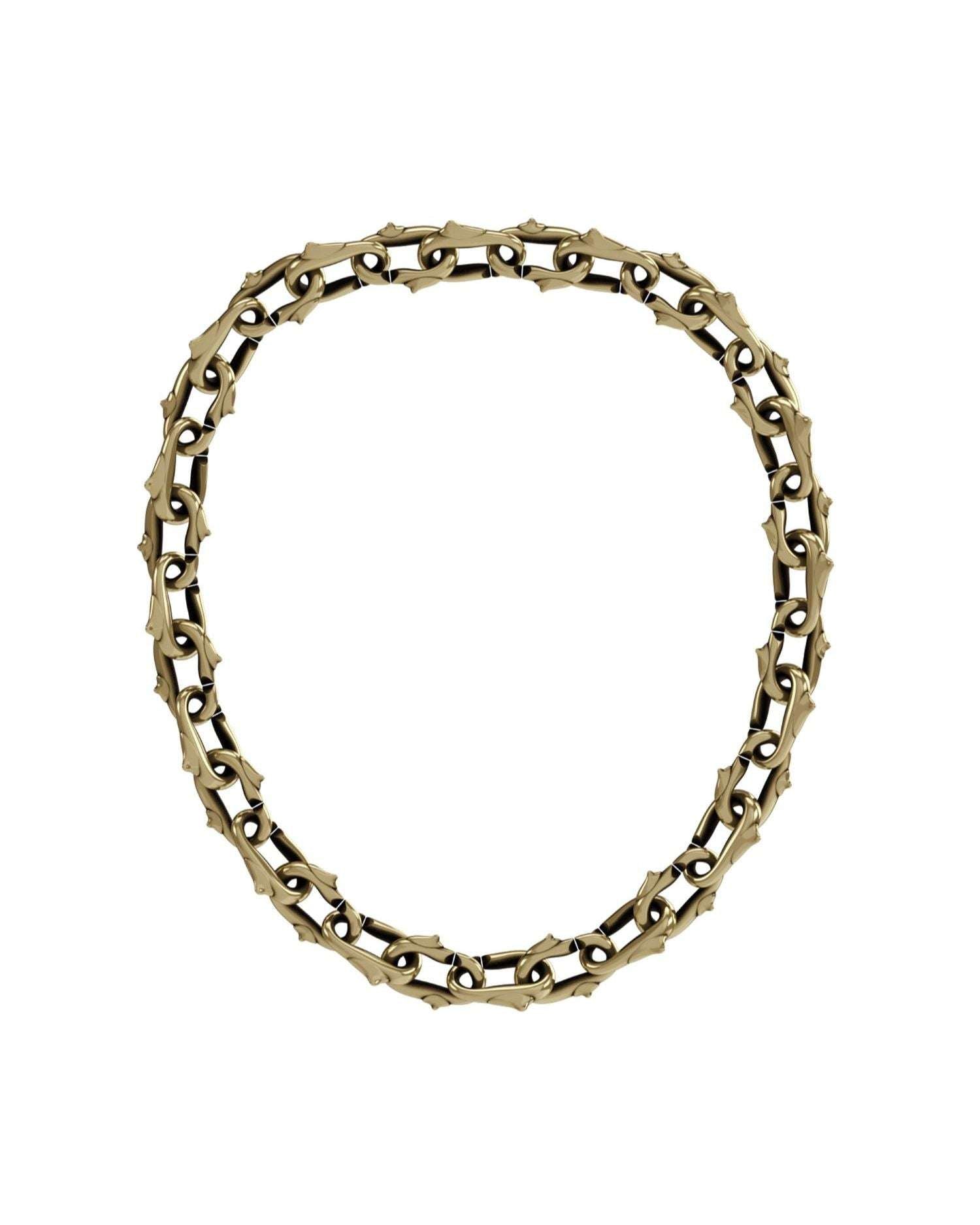Collana a catena in oro lucido, caratterizzata da maglie articolate a forma di spine intrecciate.