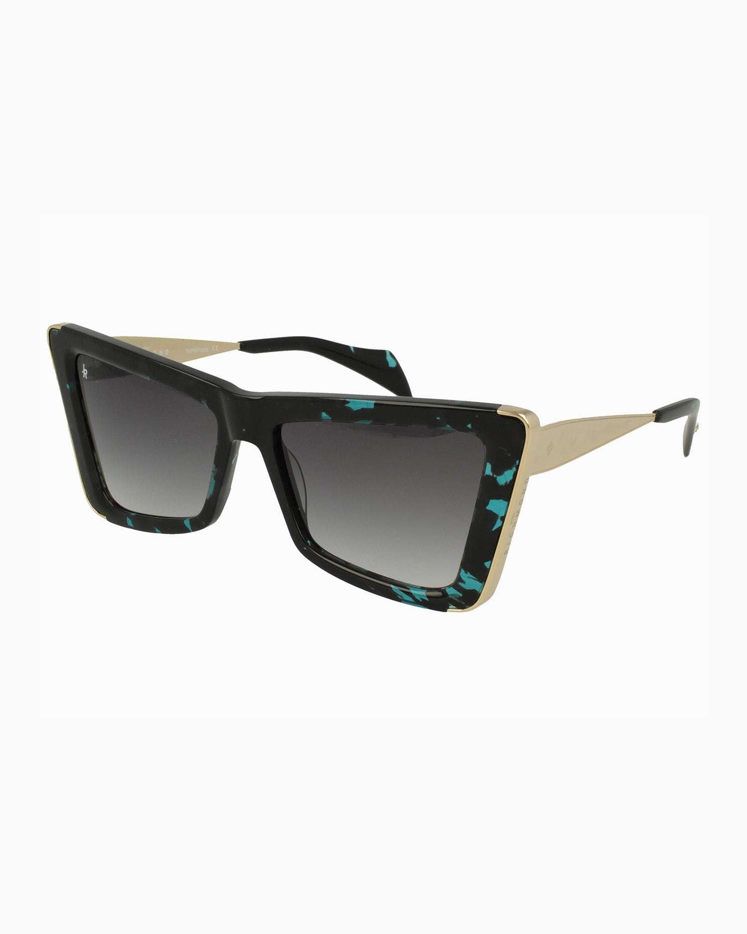 Occhiali da sole rettangolari di colore nero con venature celesti. Lenti sfumate grigie e aste metalliche di colore dorato.