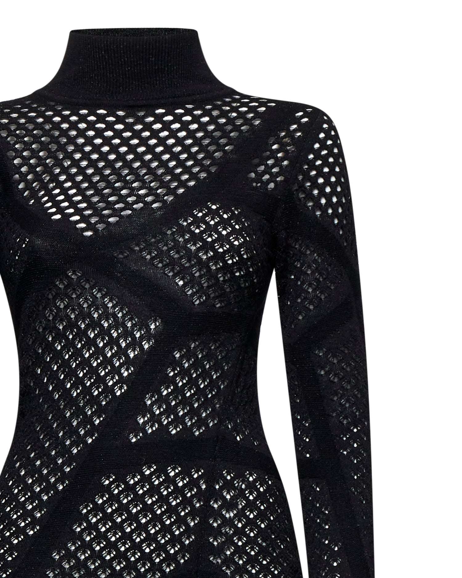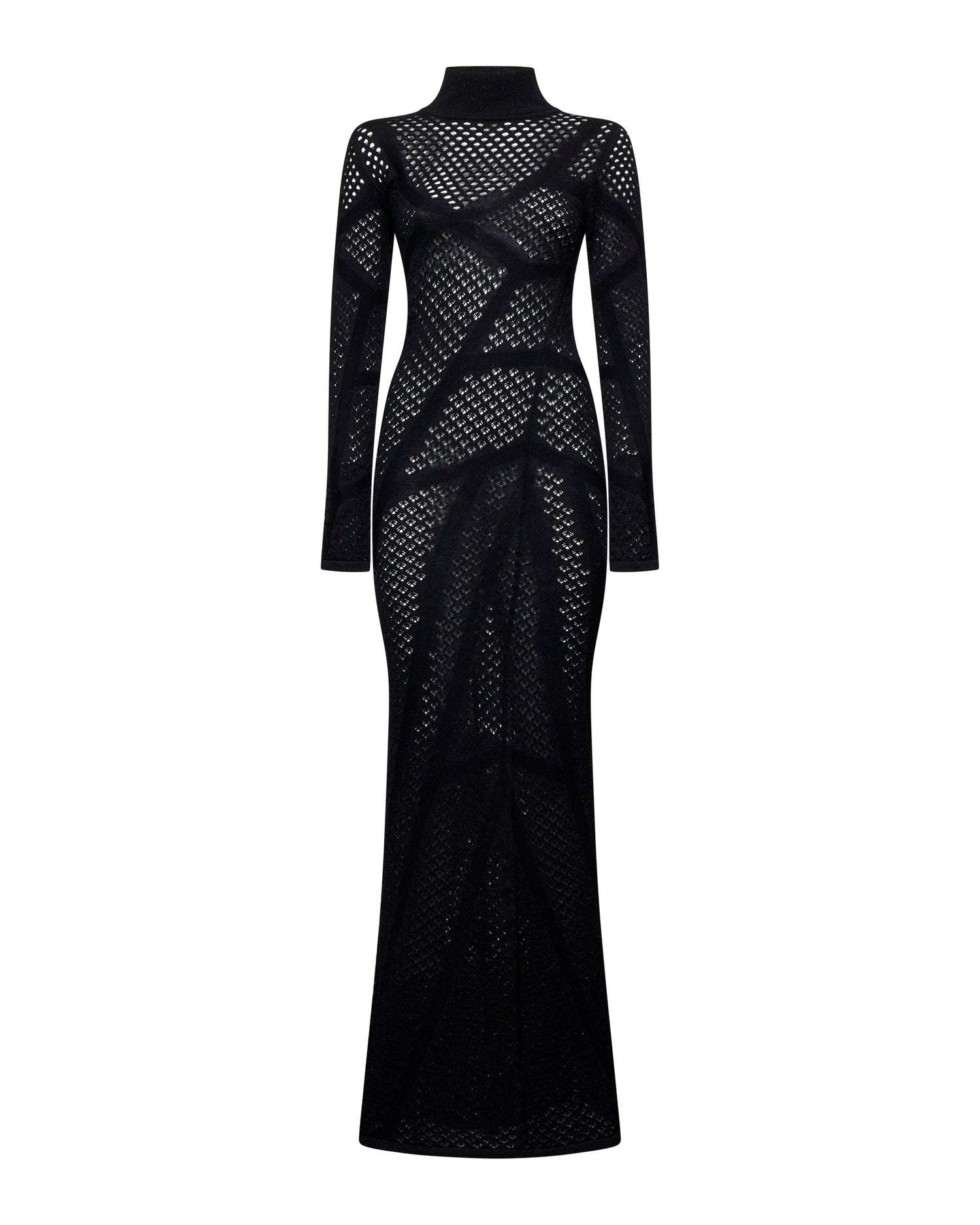 Un abito lungo dal design sofisticato che gioca con trasparenze e geometrie moderne. La lavorazione a rete crea un effetto sensuale e ricercato, mentre le linee slanciate valorizzano la figura con eleganza. Ideale per serate speciali e occasioni di stile.