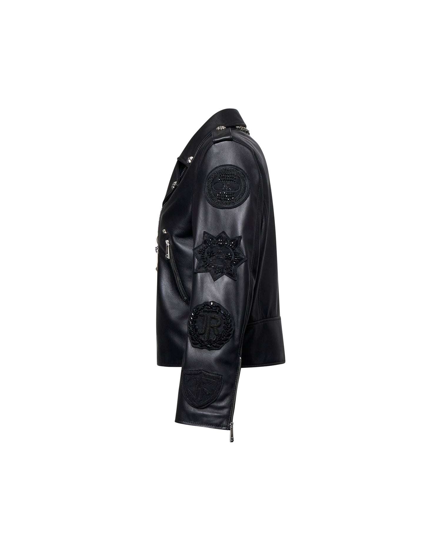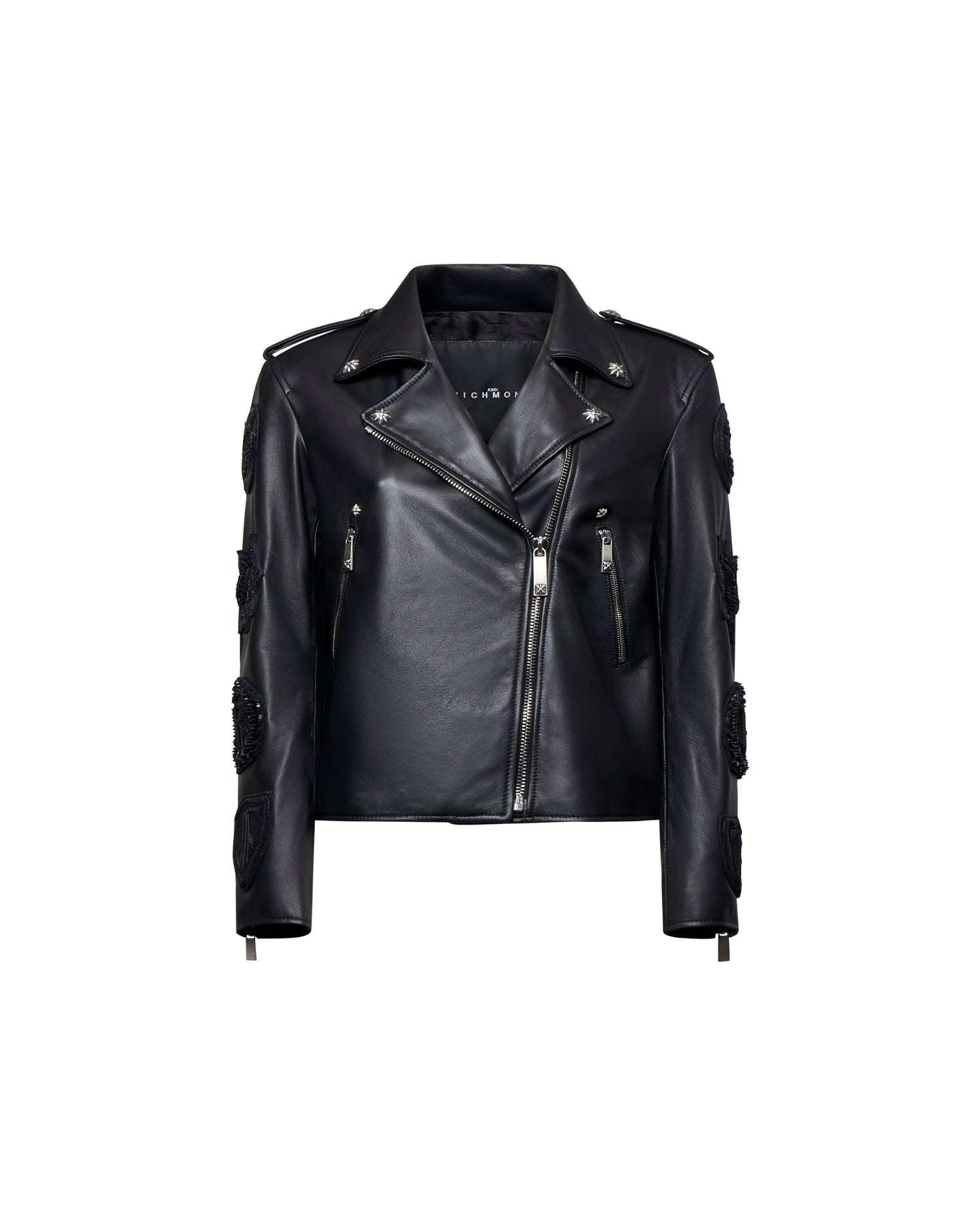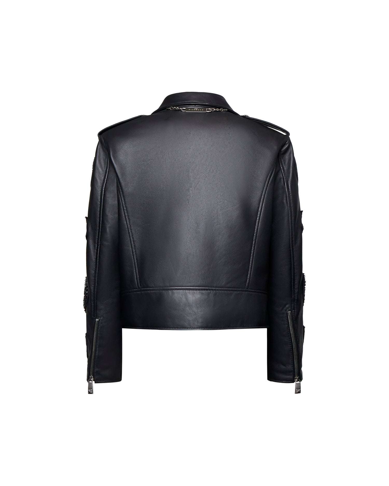 Questa giacca biker è un capo iconico che esprime carattere e modernità. Le applicazioni decorative sulle maniche e i dettagli metallici donano un tocco deciso e ricercato, rendendola un must-have per chi ama distinguersi con uno stile grintoso e contemporaneo.