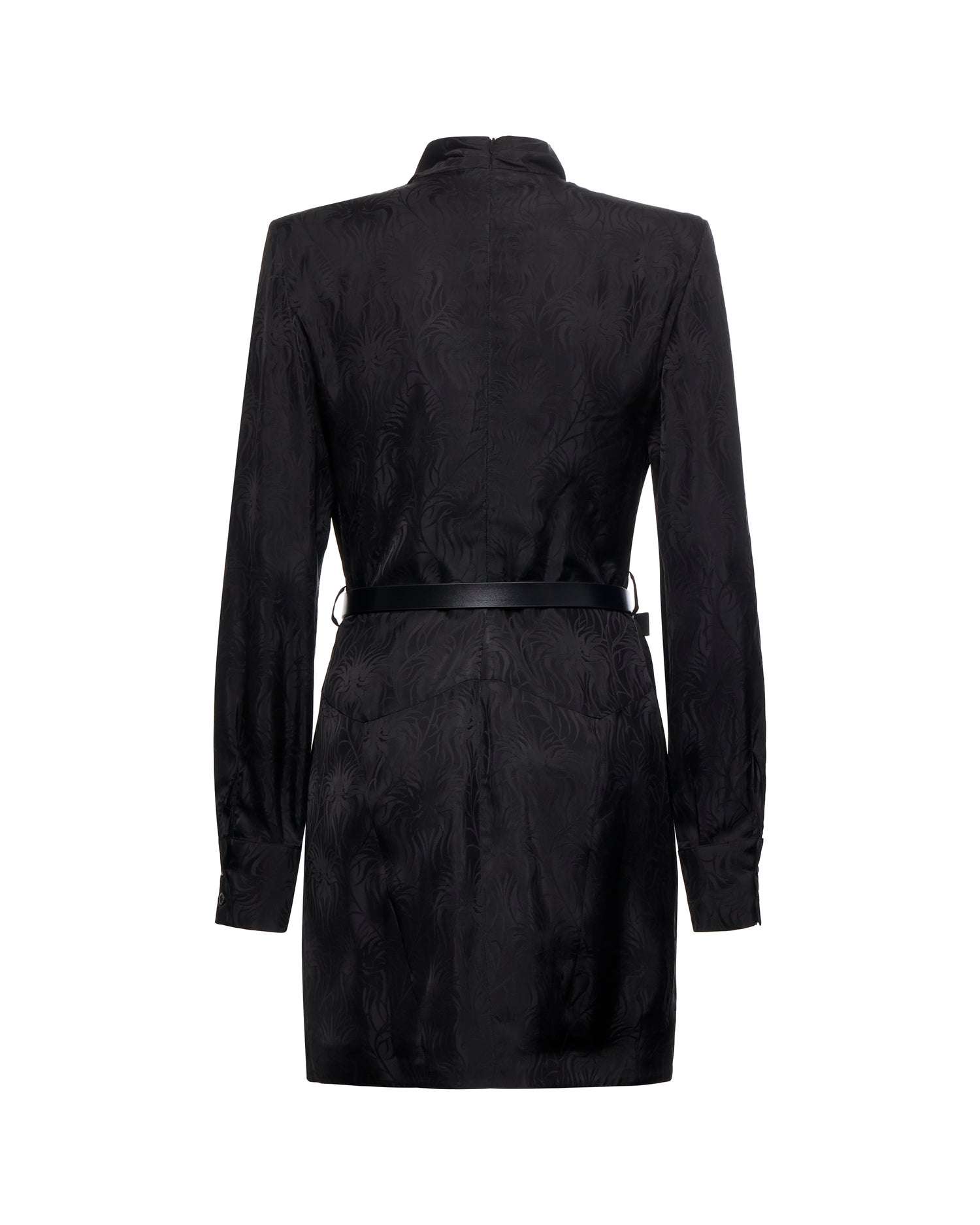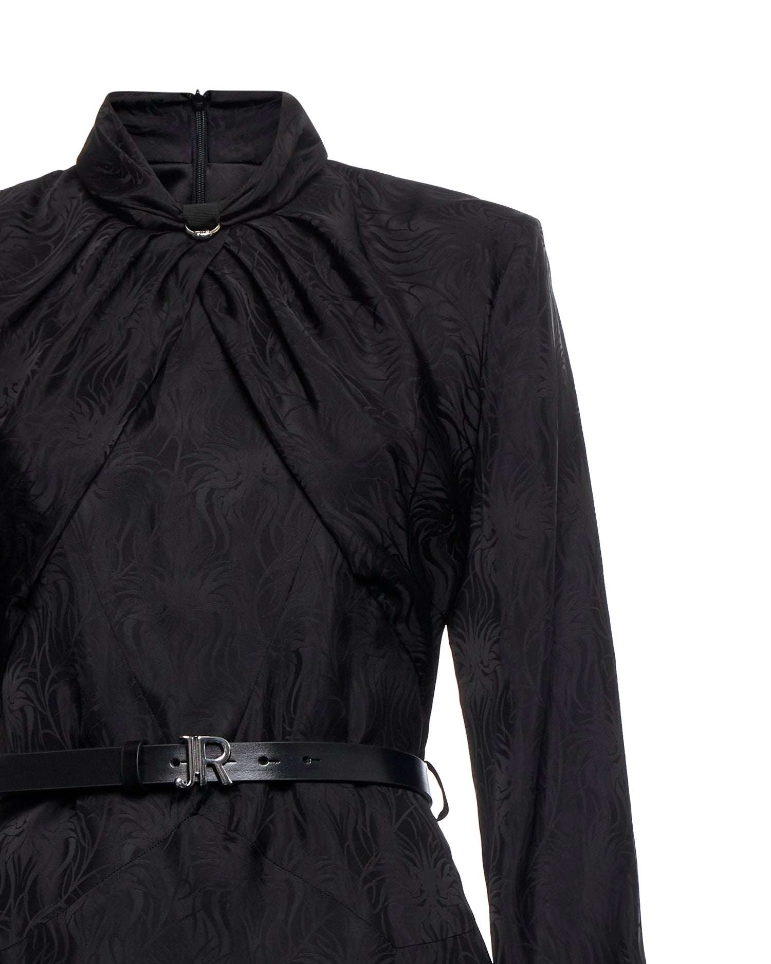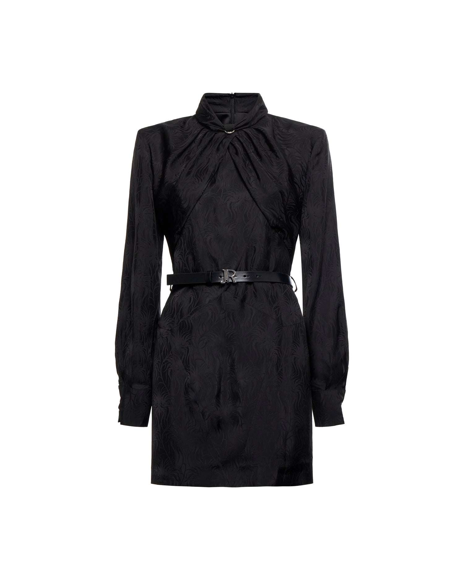 Questo abito corto unisce eleganza e modernità con il suo design raffinato. Il collo arricciato aggiunge un tocco sofisticato, mentre la cintura in vita con fibbia logata valorizza la silhouette e dona carattere all’insieme. Un capo perfetto per occasioni serali e look distintivi.