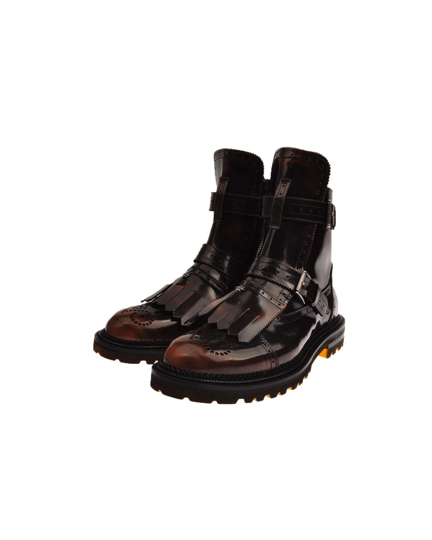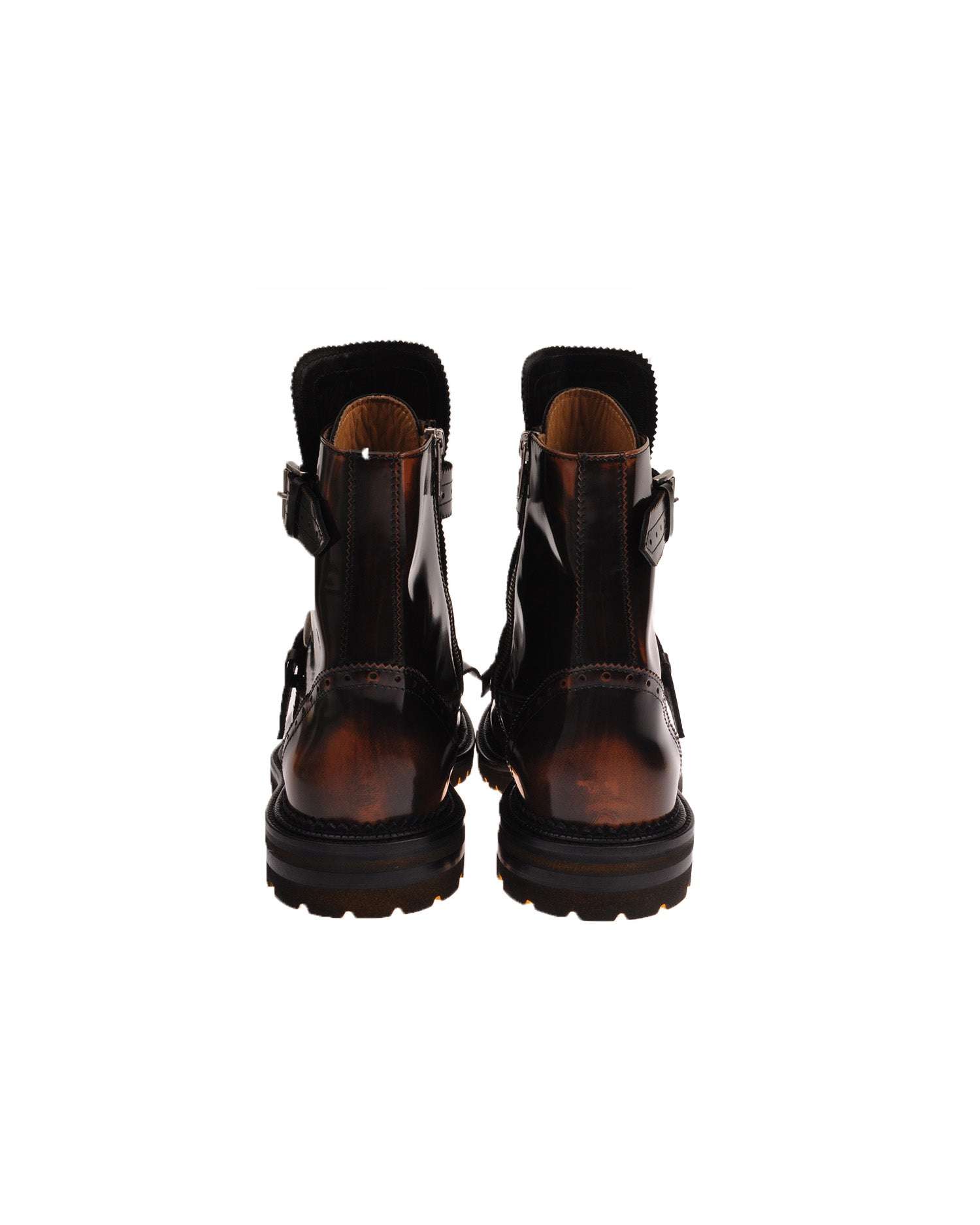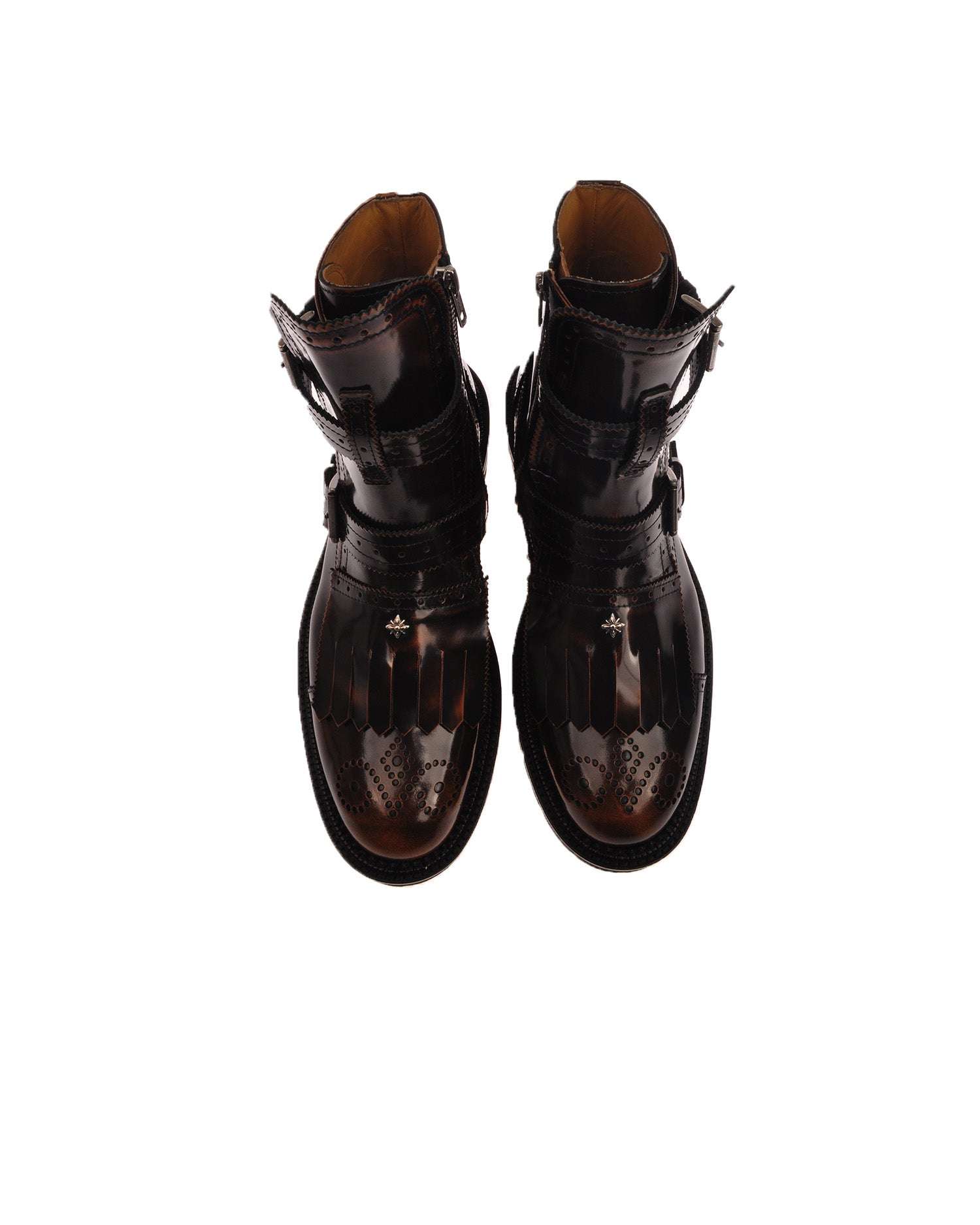 Stivaletto dal design deciso con fibbie regolabili e punta impreziosita da trafori decorativi. Un modello che unisce eleganza e spirito contemporaneo, ideale per look urbani e originali.