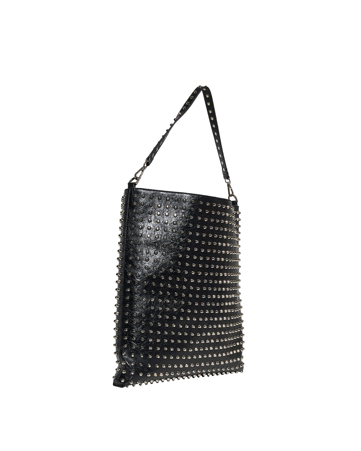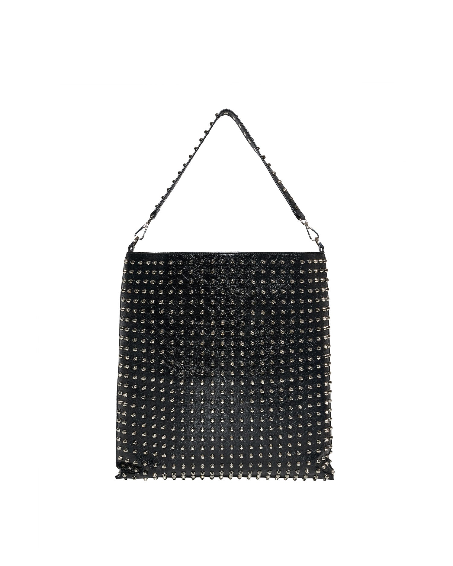 Borsa a spalla dal design deciso e contemporaneo, caratterizzata da applicazioni di borchie distribuite su tutta la superficie che donano un forte impatto visivo e un’estetica grintosa. Un accessorio pensato per completare look moderni con un tocco audace e distintivo.