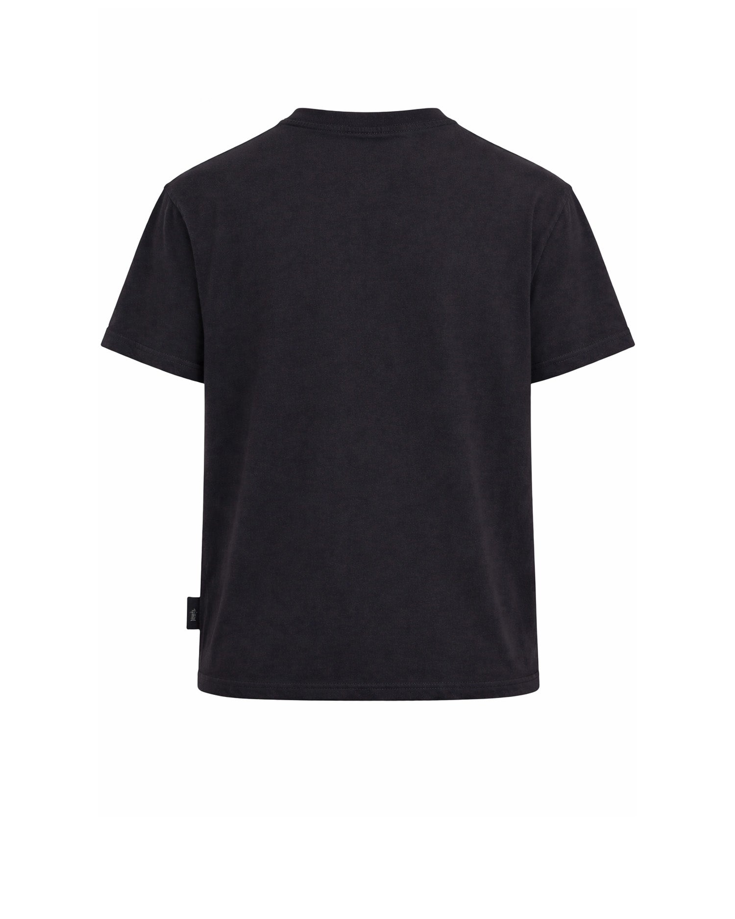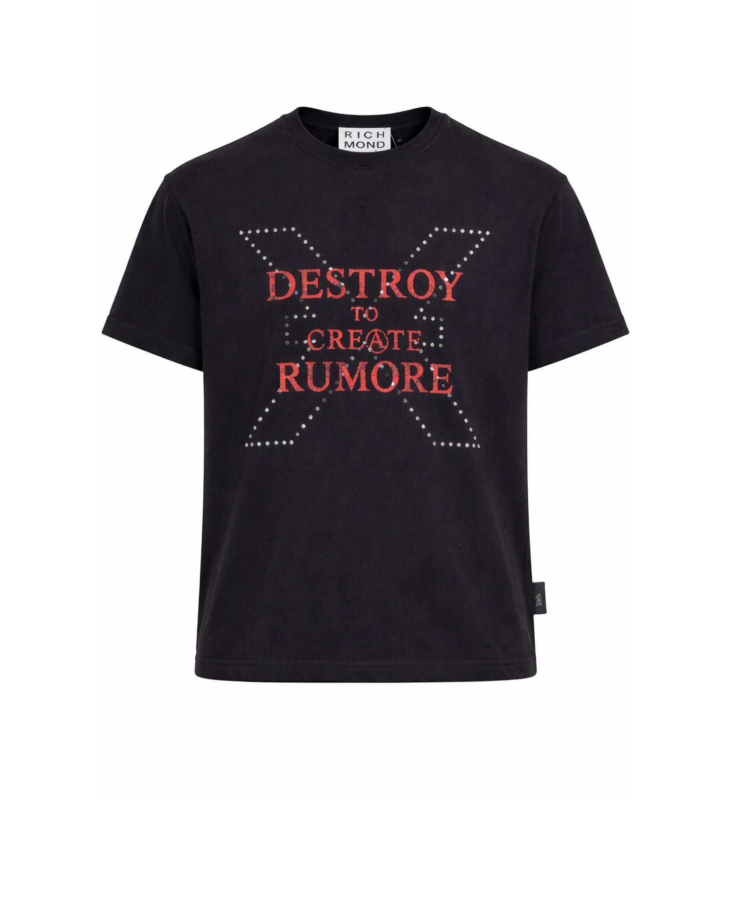 Questa t-shirt nera a con grafica frontale si distingue per il suo design d’impatto e contemporaneo. La stampa centrale con lettering crea un forte contrasto visivo, arricchita da un motivo grafico a punti che incornicia la scritta e dona un effetto moderno e distintivo.