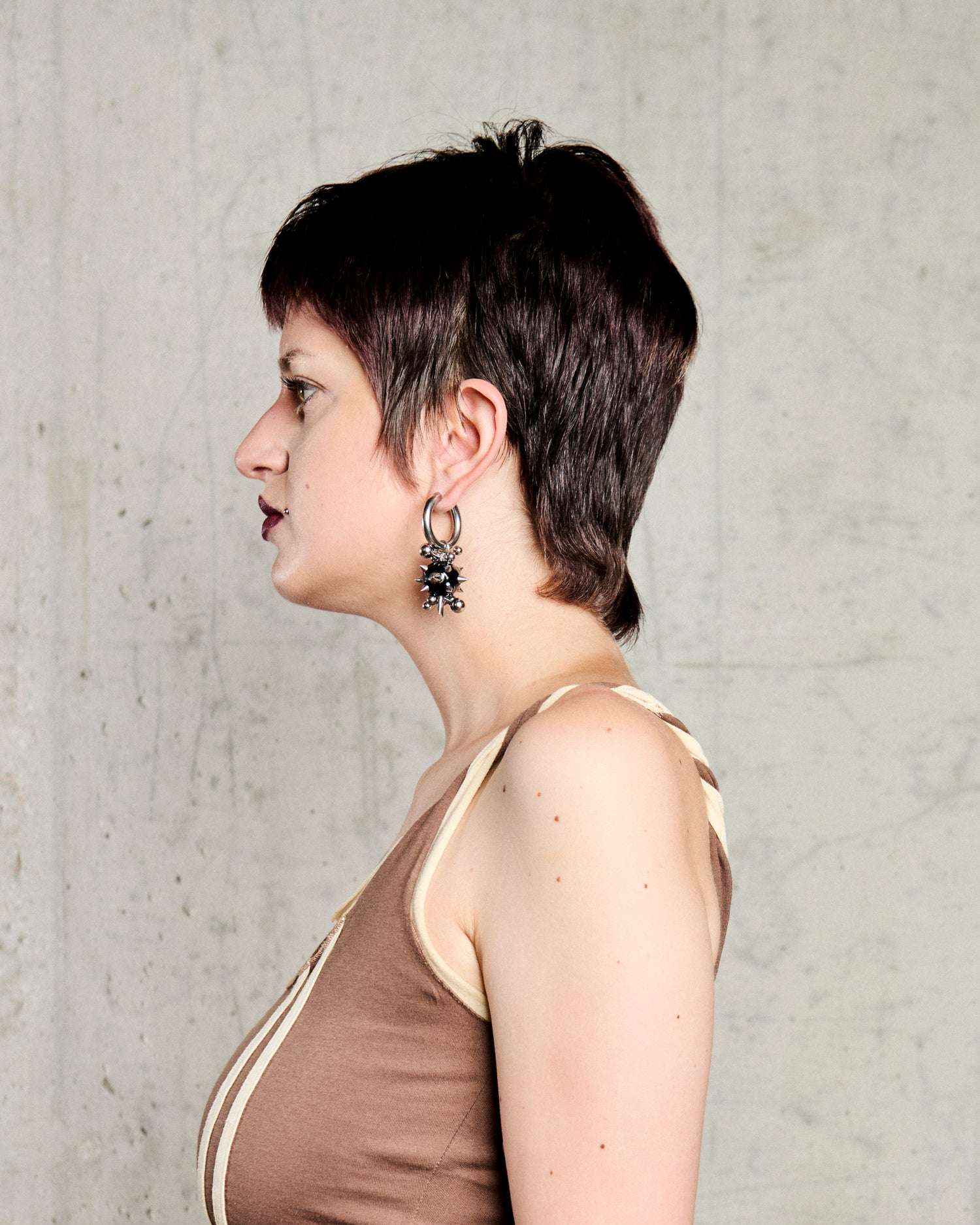 Orecchini a cerchio con pendente a forma di sfera spinata, dal design deciso e dal forte impatto visivo. Un accessorio dal carattere bold, perfetto per completare look audaci o dare un tocco inaspettato a uno stile essenziale.