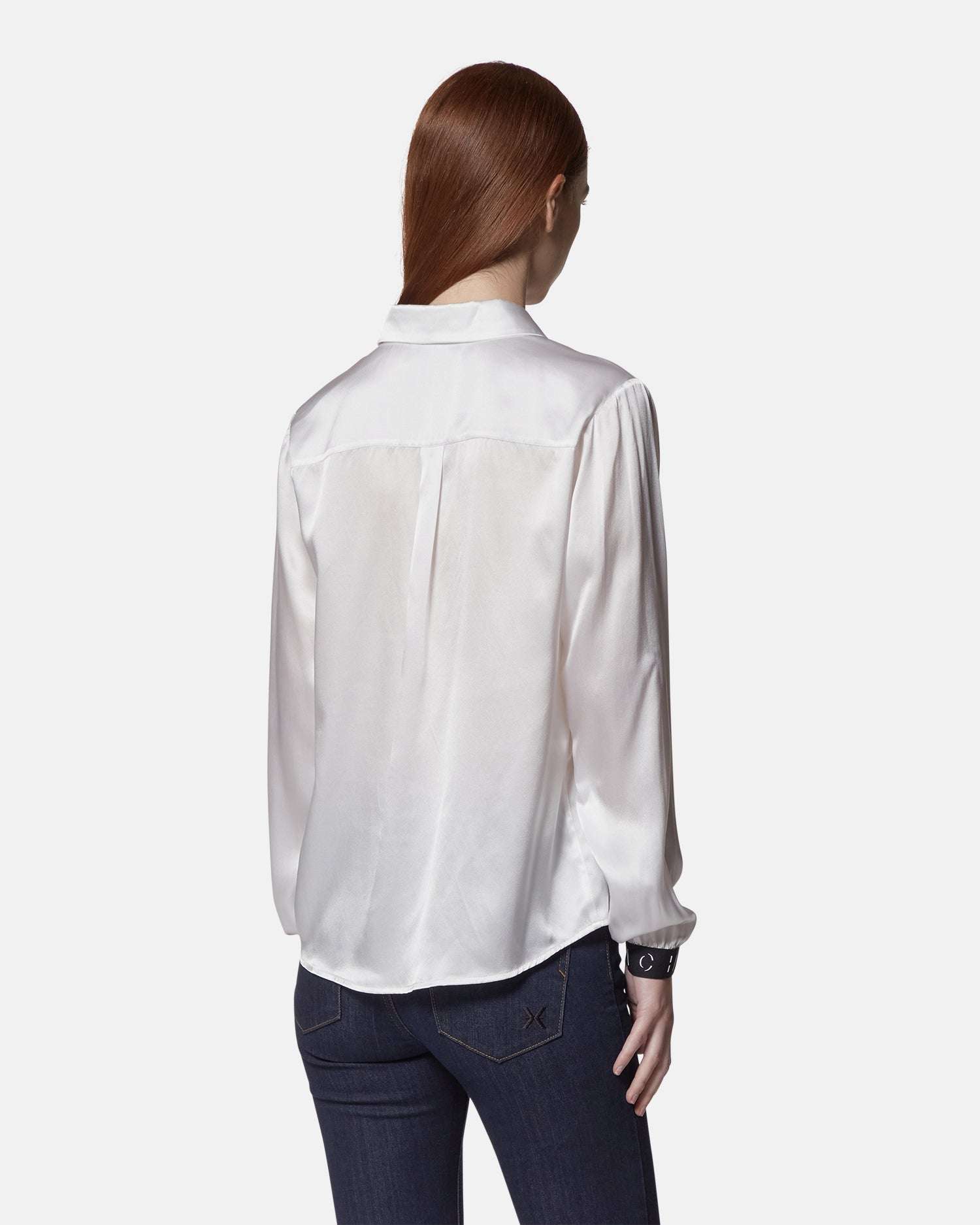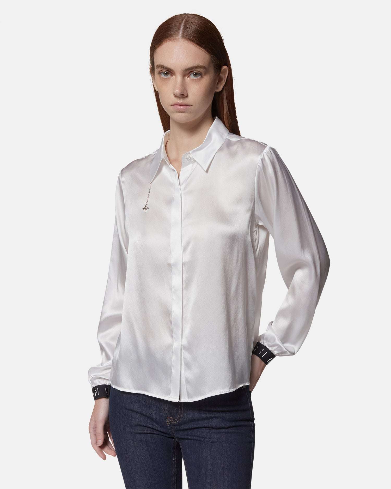 Questa camicia in raso bianco unisce eleganza classica e dettagli moderni, perfetta per completare un look sofisticato. Realizzata in tessuto satinato leggero e luminoso, presenta un colletto classico, una chiusura frontale con bottoni e maniche lunghe che ne esaltano la raffinatezza. I polsini decorati con dettagli distintivi aggiungono un tocco originale al design essenziale. Ideale per occasioni formali o abbinamenti casual chic, questa camicia è un must-have per ogni guardaroba elegante.