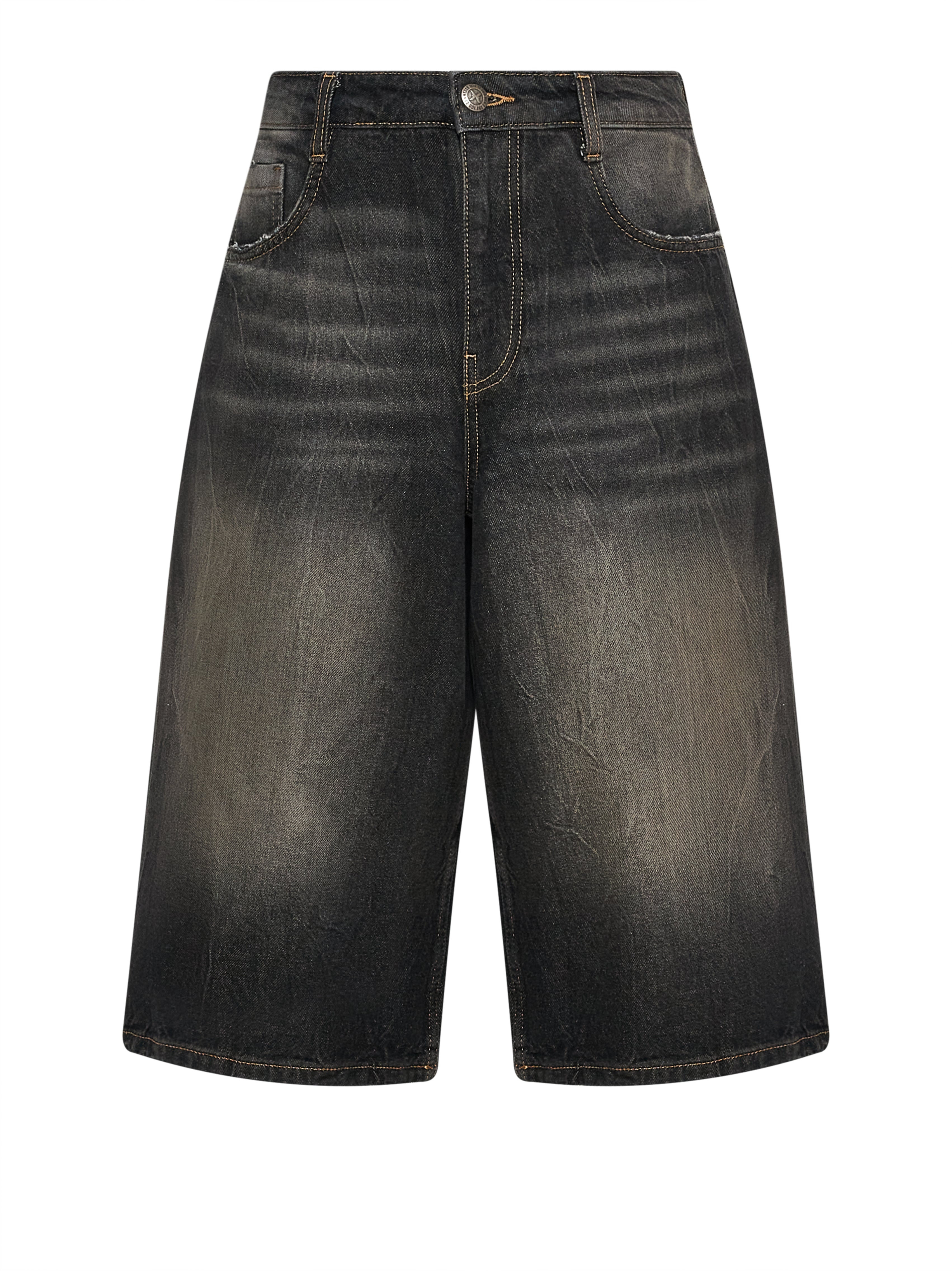 Bermuda genderless in denim con effetto used e costruzione sartoriale