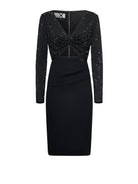 Abito midi dall’estetica sofisticata, caratterizzato da una costruzione che unisce un bustier drappeggiato a un design lineare e pulito. Lo scollo profondo valorizza la parte superiore, mentre le maniche lunghe e la gonna essenziale creano un equilibrio raffinato tra sensualità e rigore formale. Un capo pensato per occasioni serali di forte impatto.