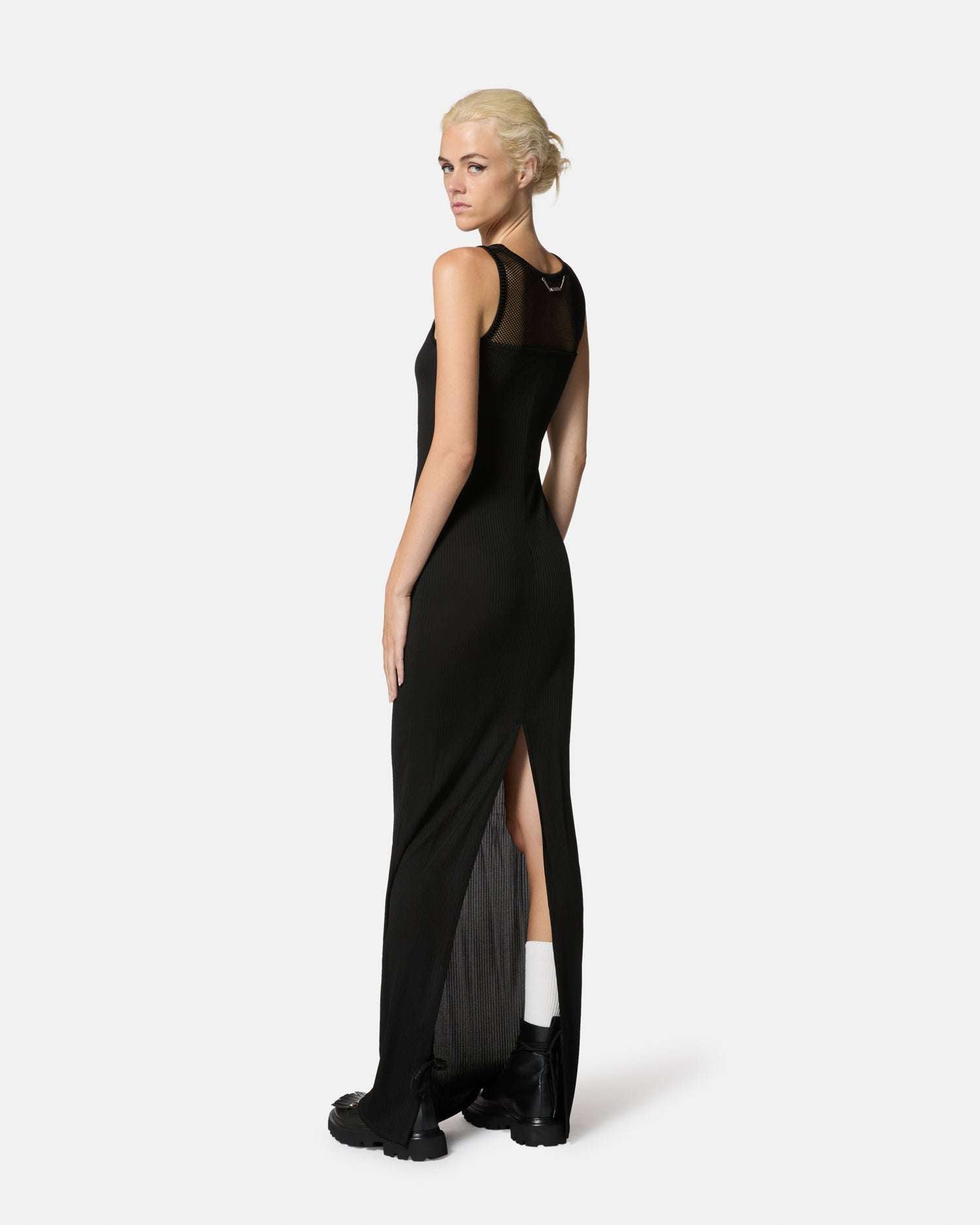 Questo abito lungo senza maniche esprime un’eleganza minimalista e moderna. Il taglio lineare e il tessuto leggero esaltano la silhouette, mentre il dettaglio gioiello applicato sul petto aggiunge un tocco raffinato e luminoso. Il design aderente si presta a occasioni speciali e serate eleganti, garantendo un look sofisticato e distintivo. Perfetto da abbinare a sandali con tacco e accessori minimal per completare un outfit impeccabile.