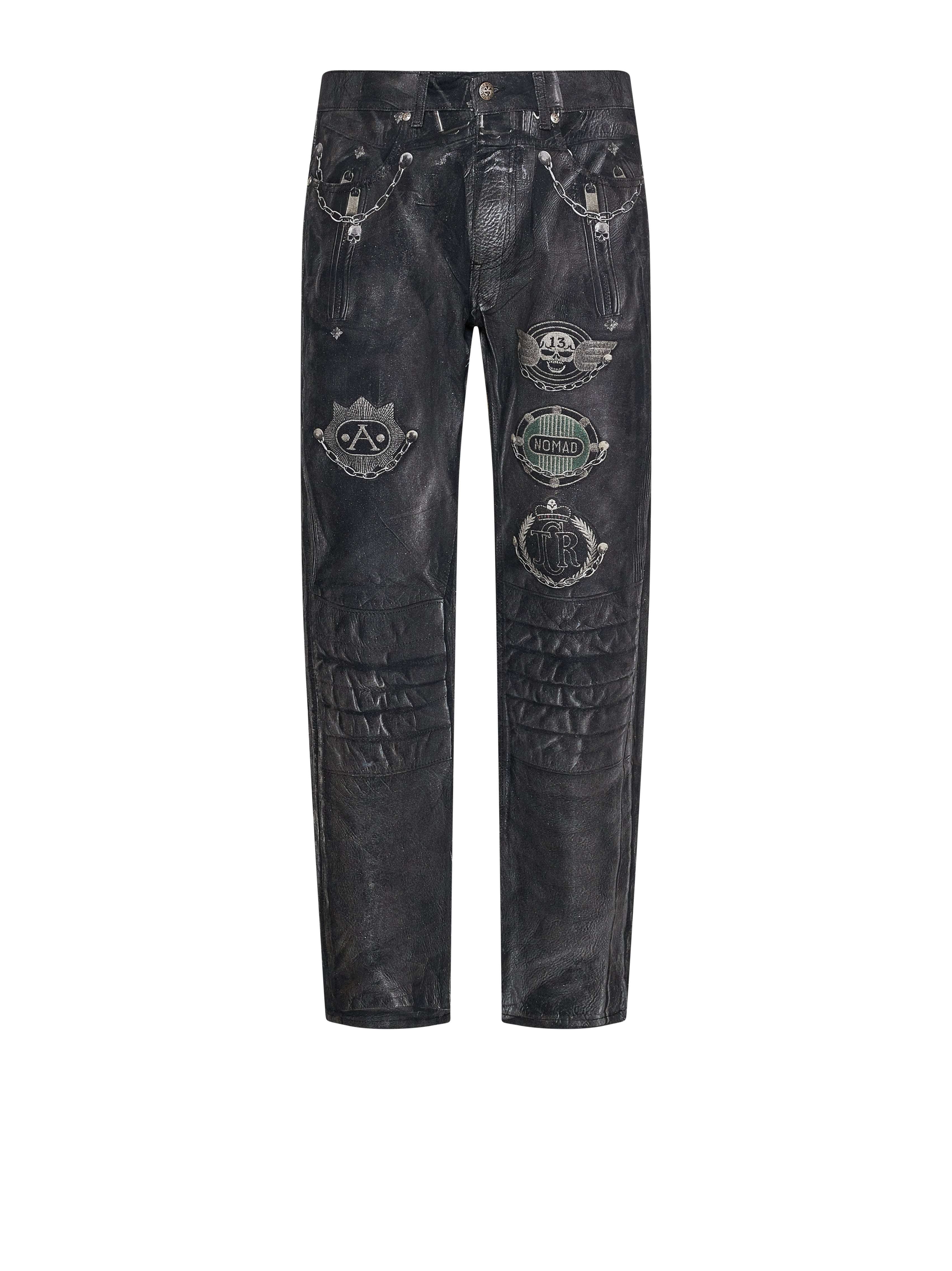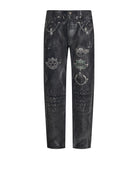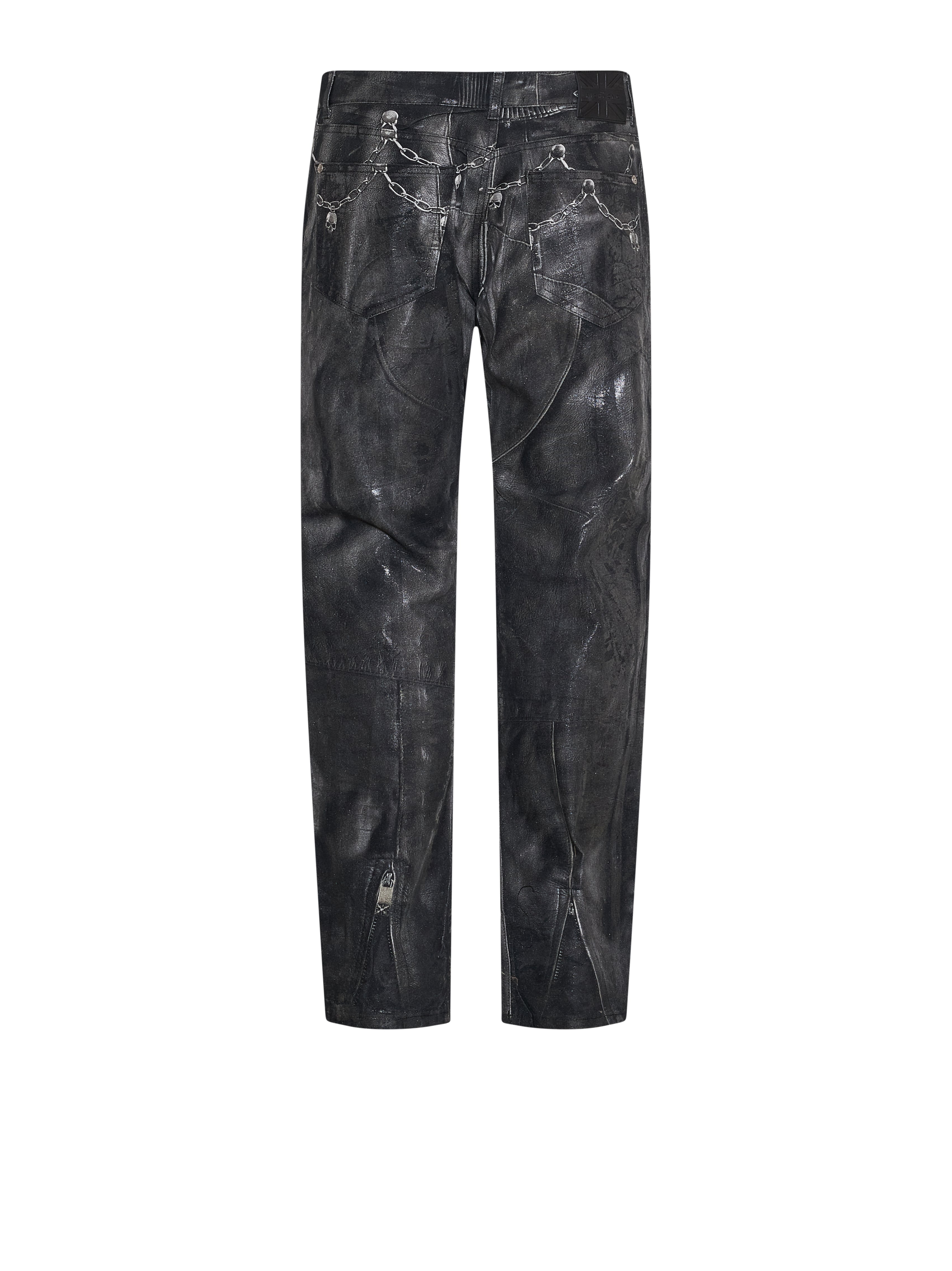 Un capo dal carattere audace, definito da una grafica applicata che conferisce profondità visiva e una forte identità espressiva. La costruzione articolata rendono questi pantaloni una proposta di forte impatto, pensata per un guardaroba luxury che valorizza ricerca stilistica e attitudine contemporanea.