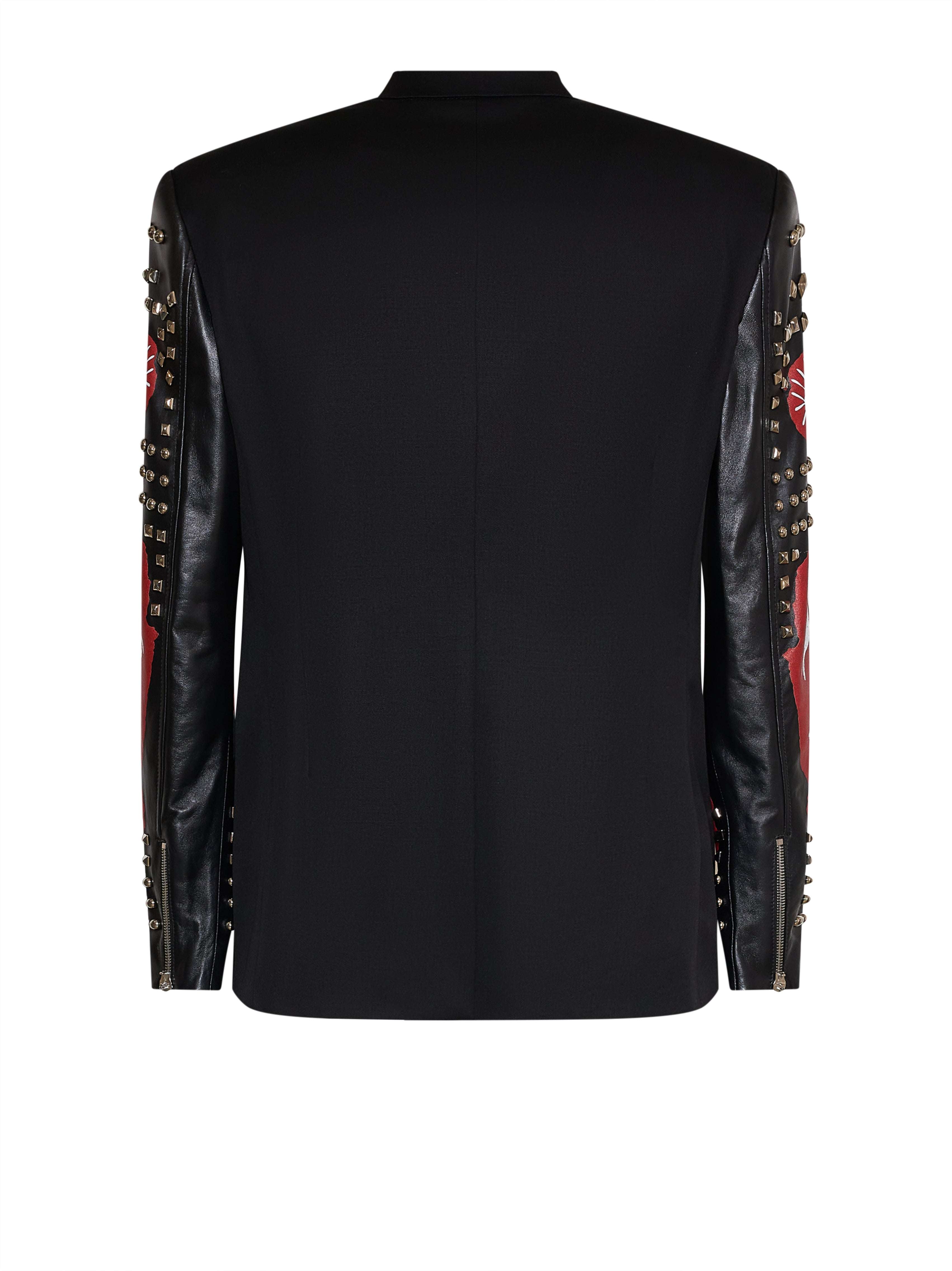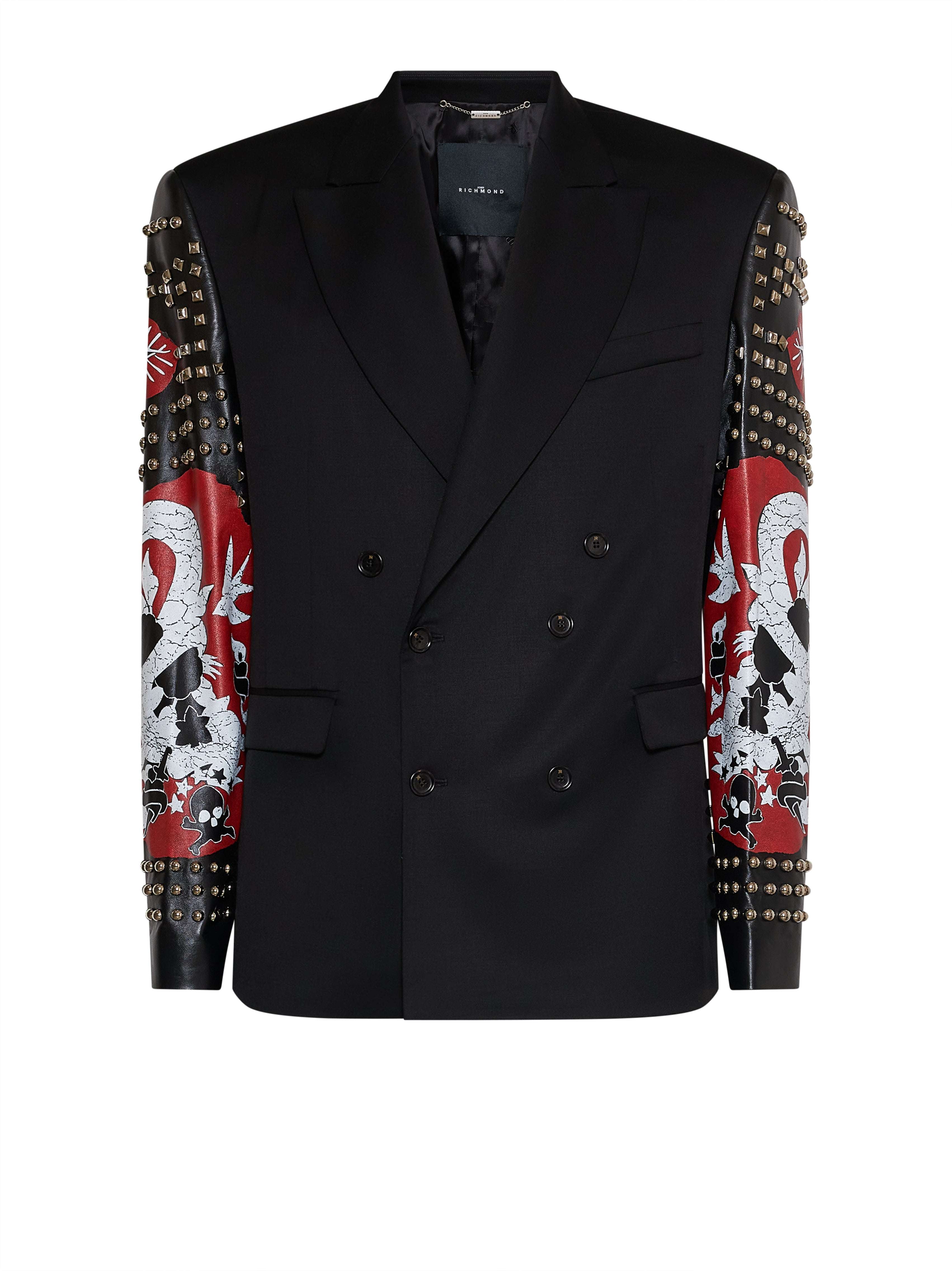 Una giacca dal forte impatto scenico che unisce rigore sartoriale ed espressione artistica. Il design doppiopetto dialoga con maniche decorate di grande intensità visiva, creando un contrasto raffinato e altamente distintivo. Un capo pensato per un guardaroba luxury che interpreta l’eleganza contemporanea con audacia e personalità.