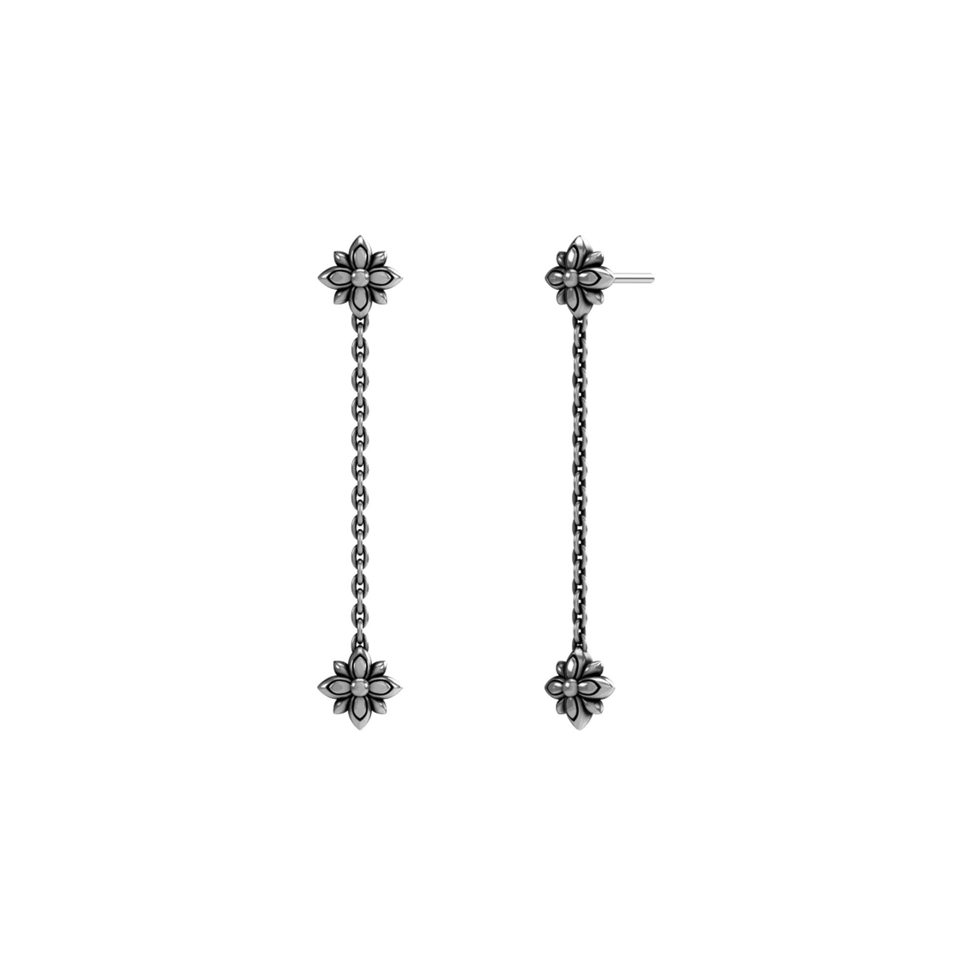 Elegant pending earrings characterized by two floral elements connected by a thin chain, for a refined and harmonious effect.