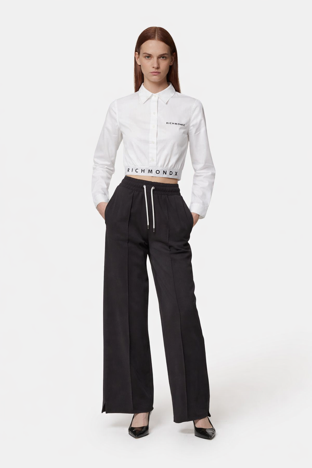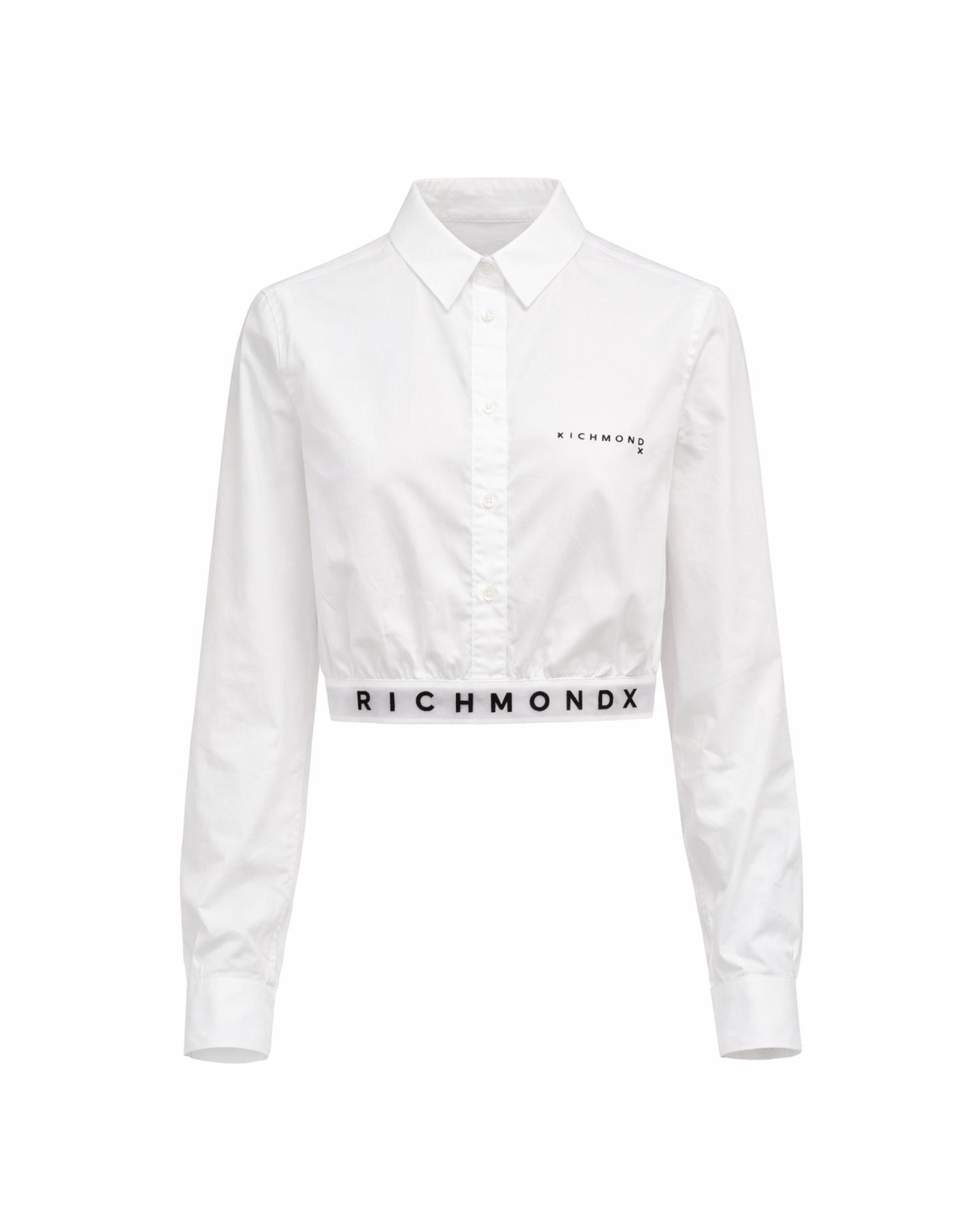 This black cropped shirt is a modern take on a timeless classic, perfect for a bold, contemporary look. Made from lightweight cotton, it features a cropped cut that reveals the elastic waistband with the "Richmond X" logo, adding a distinctive touch to the design. Featuring a classic collar, button closure and a small logo on the chest, it is ideal for casual-chic or streetwear combinations. Perfect to wear with high-waisted trousers or joggers for a versatile and fashionable outfit.