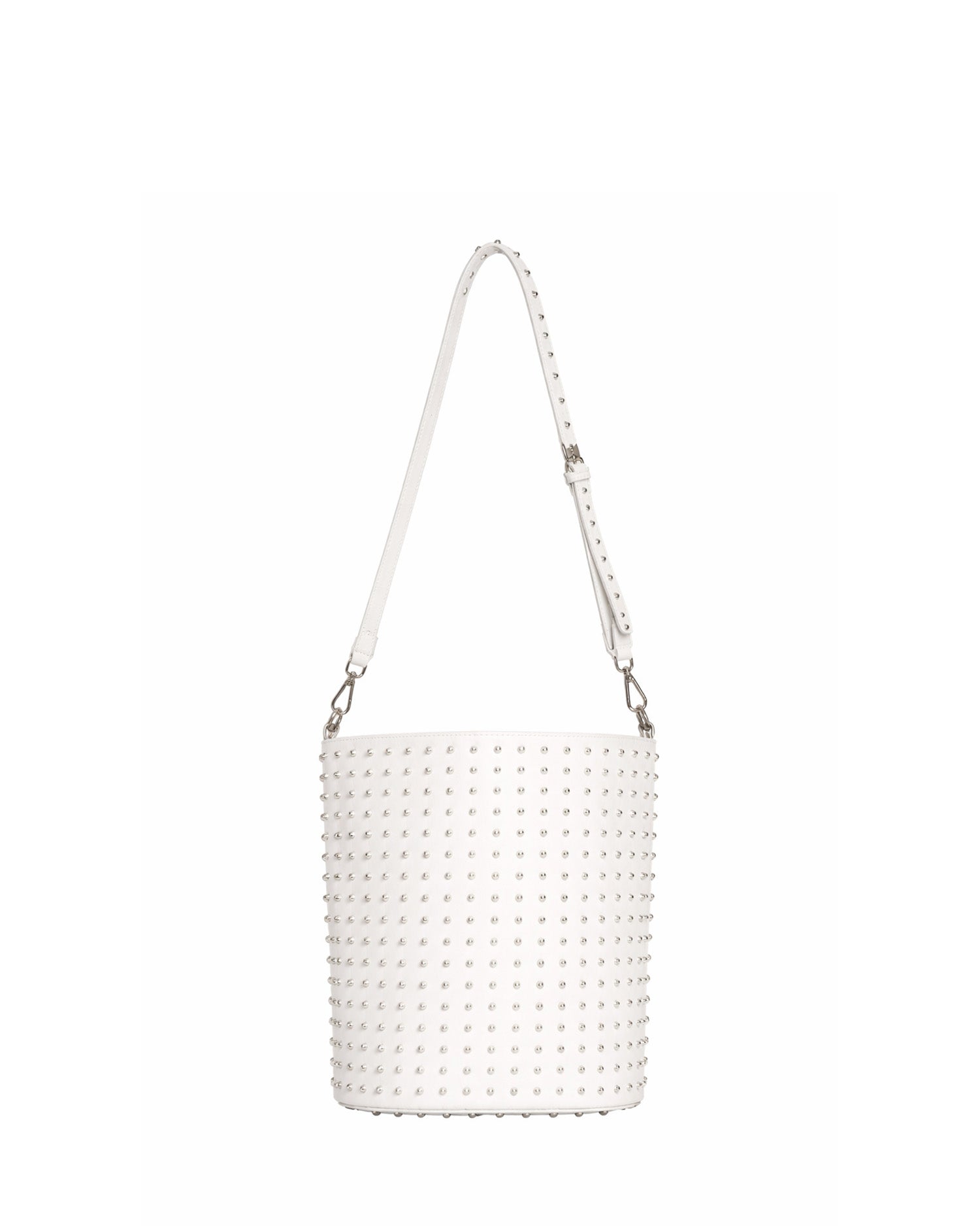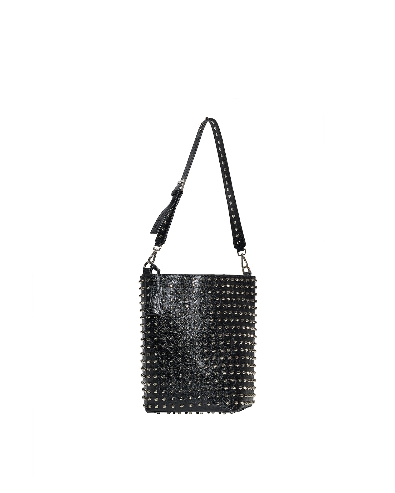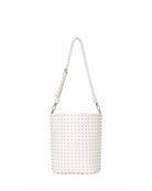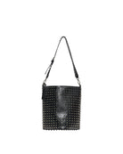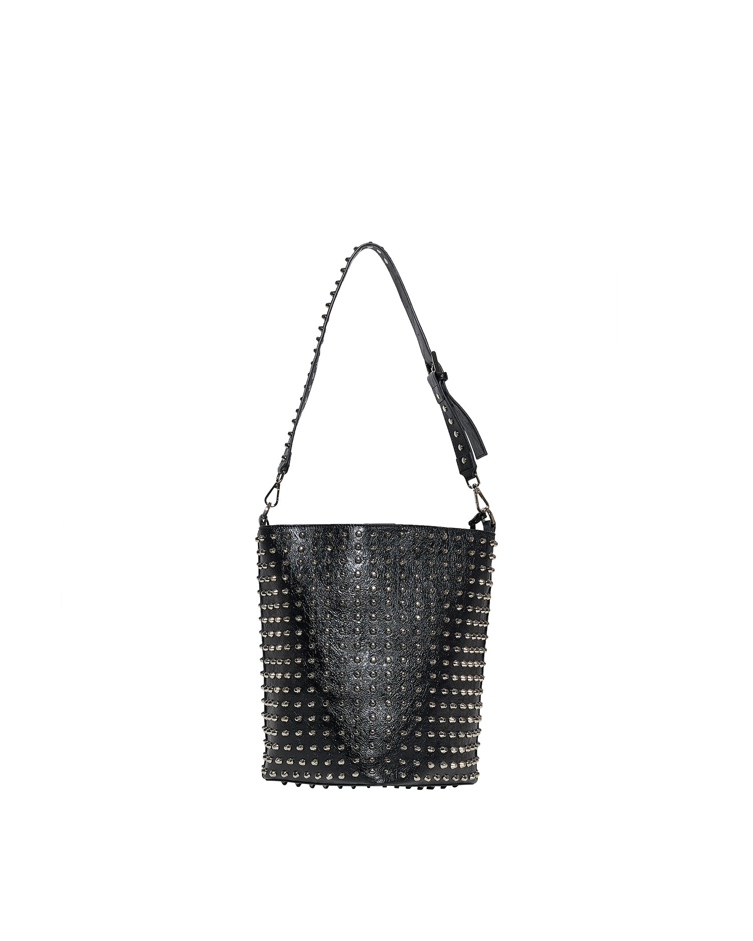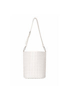 Bucket bag with a strong and contemporary design, characterized by a surface rich in decorative details that enhance its visual impact. The chain adds a modern and distinctive touch, making the accessory ideal for completing urban looks with character.