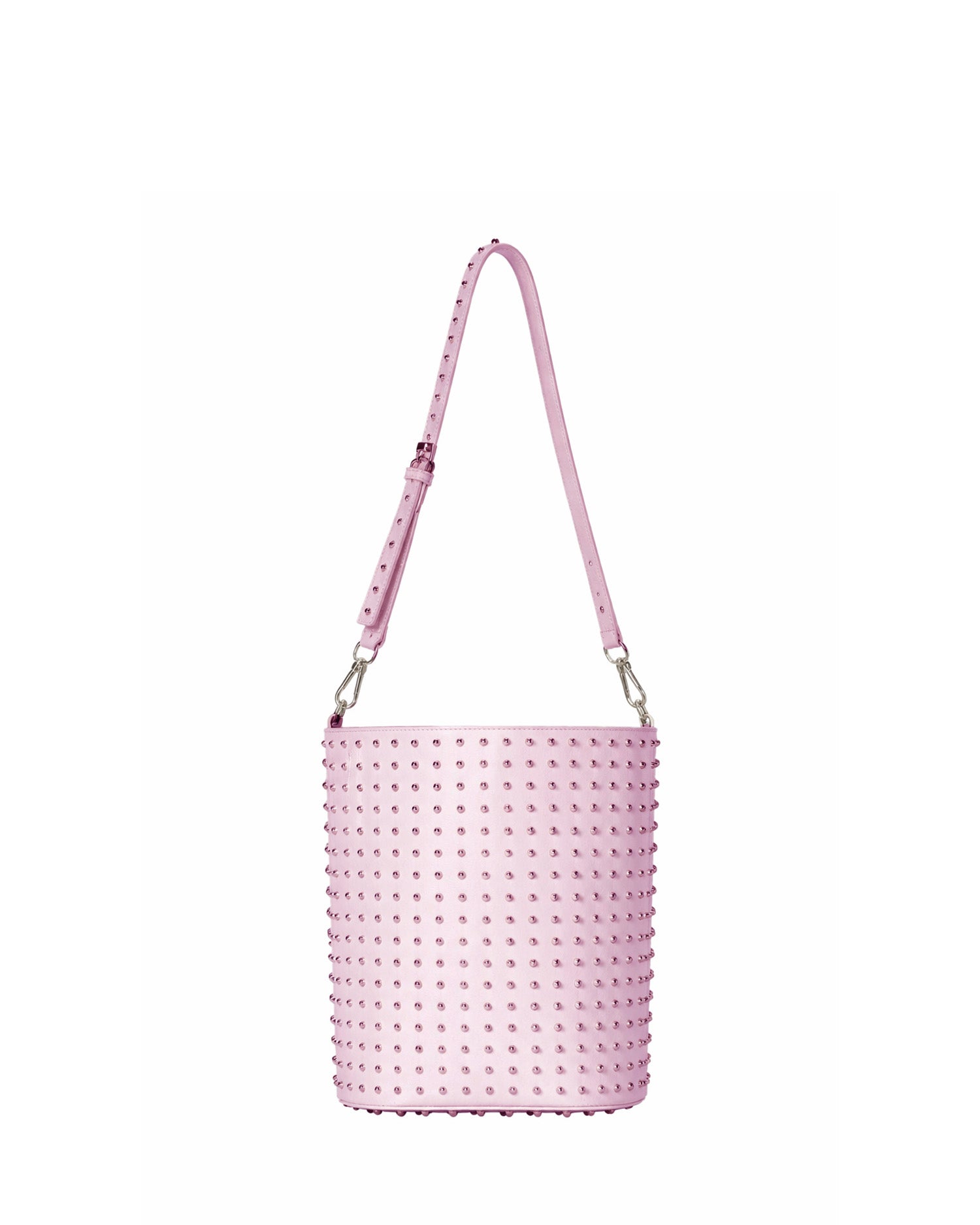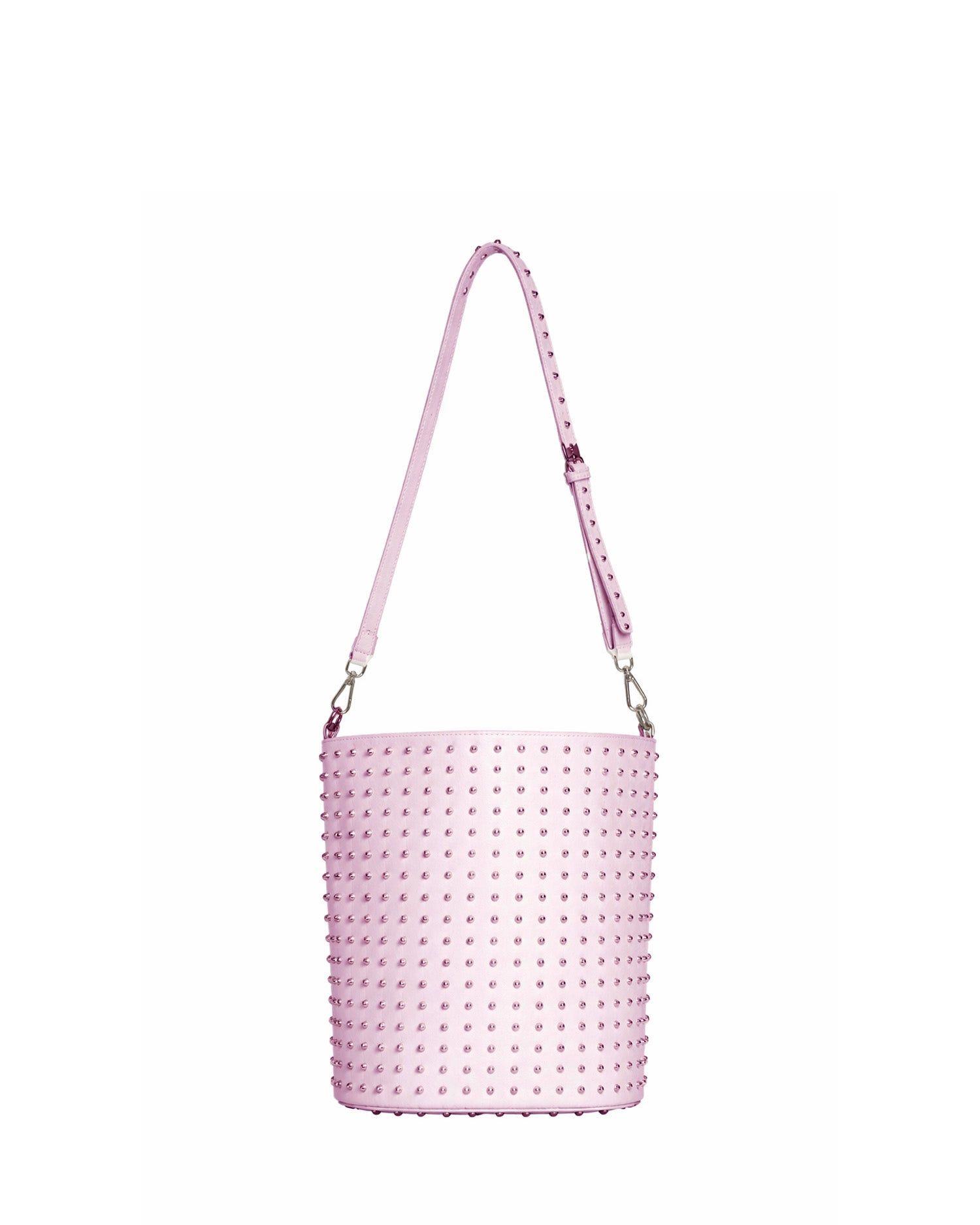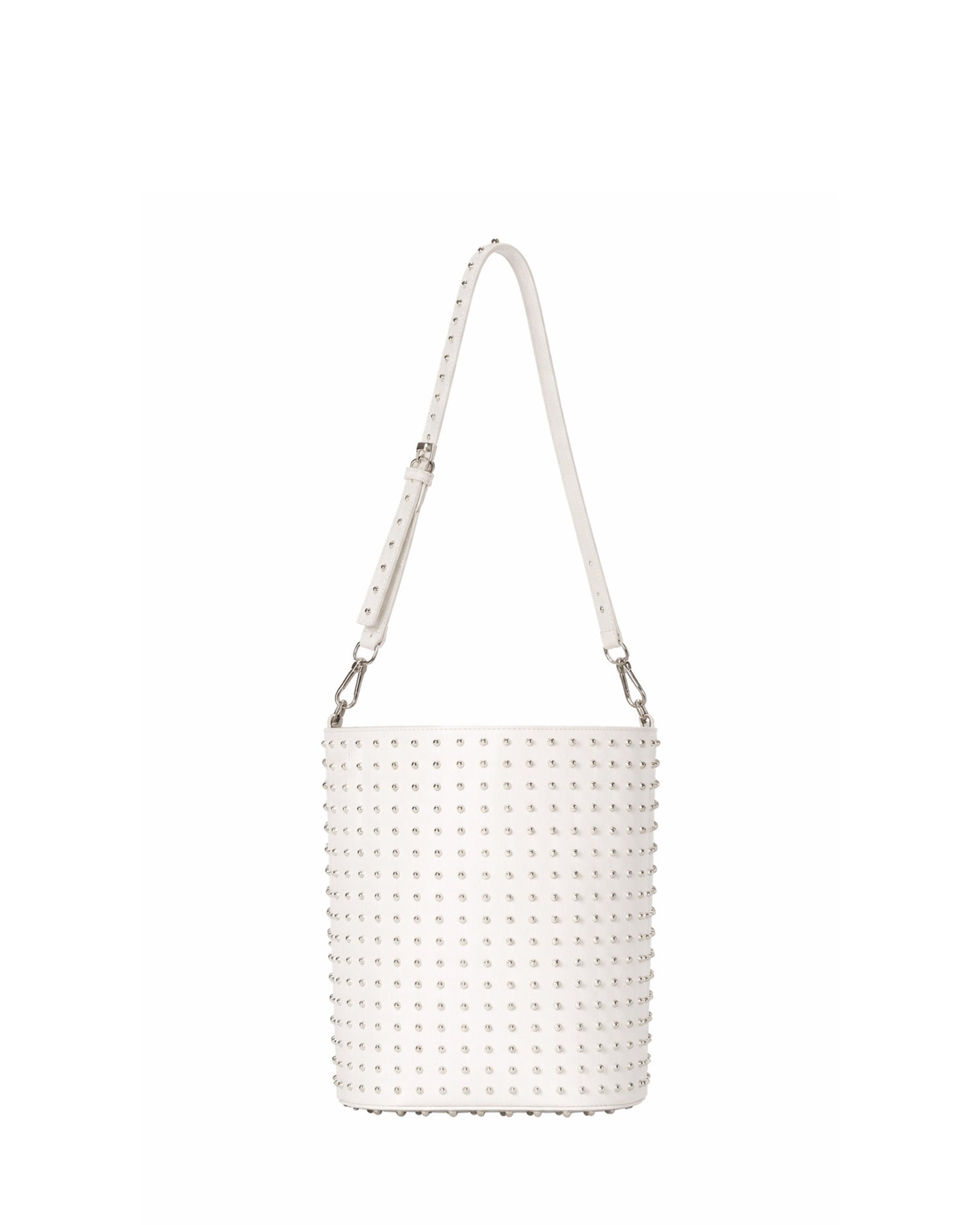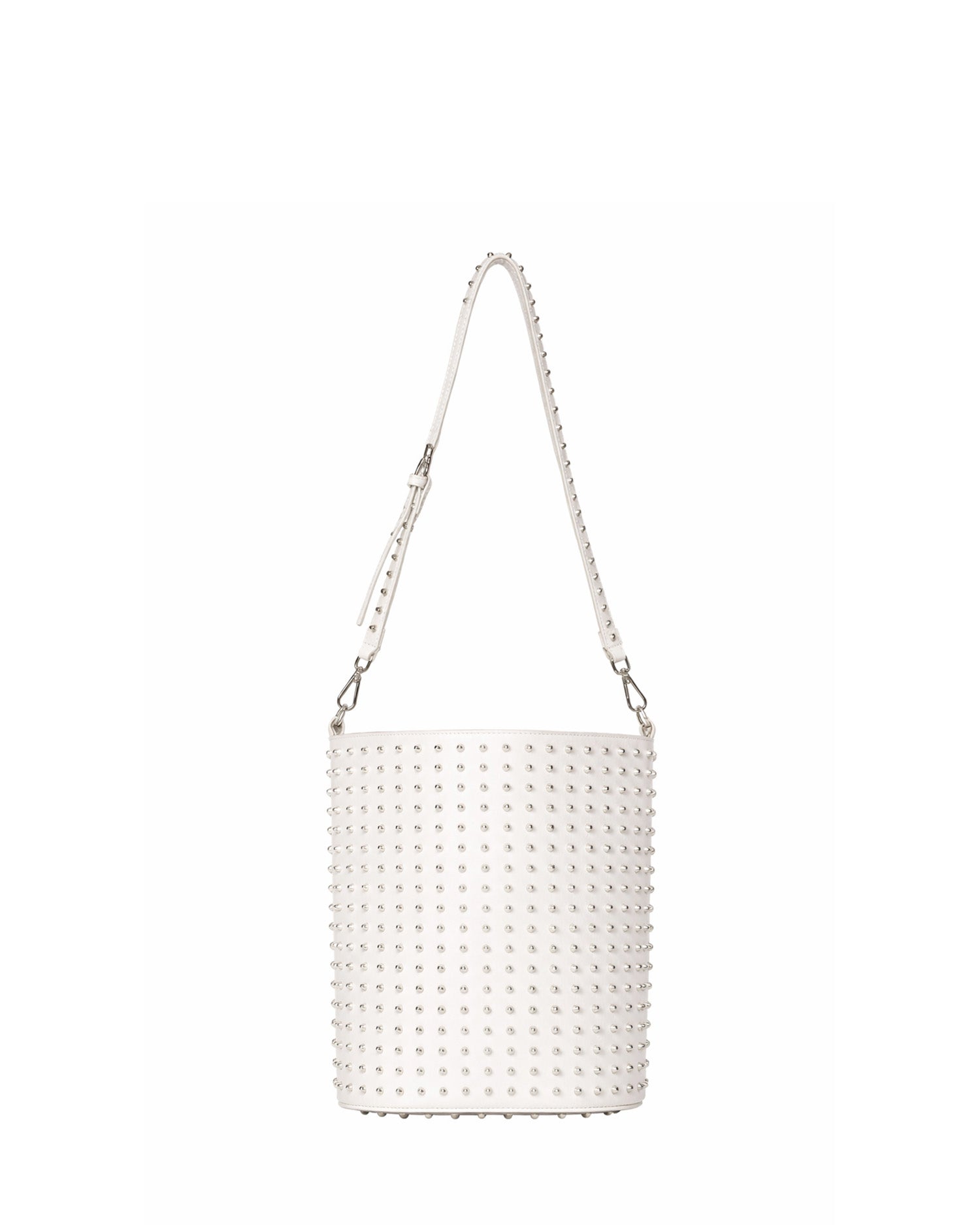 Bucket bag with a strong and contemporary design, characterized by a surface rich in decorative details that enhance its visual impact. The chain adds a modern and distinctive touch, making the accessory ideal for completing urban looks with character.