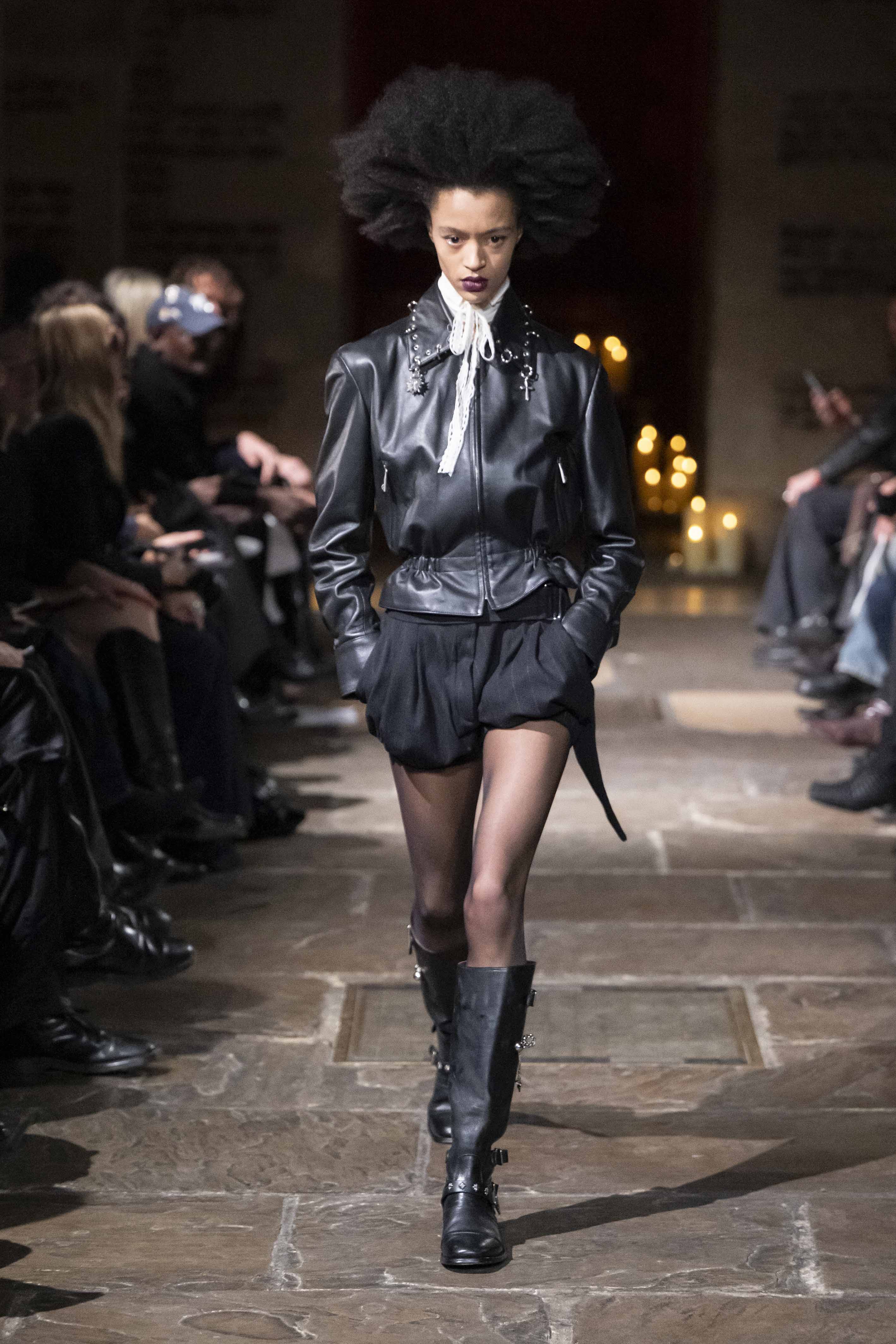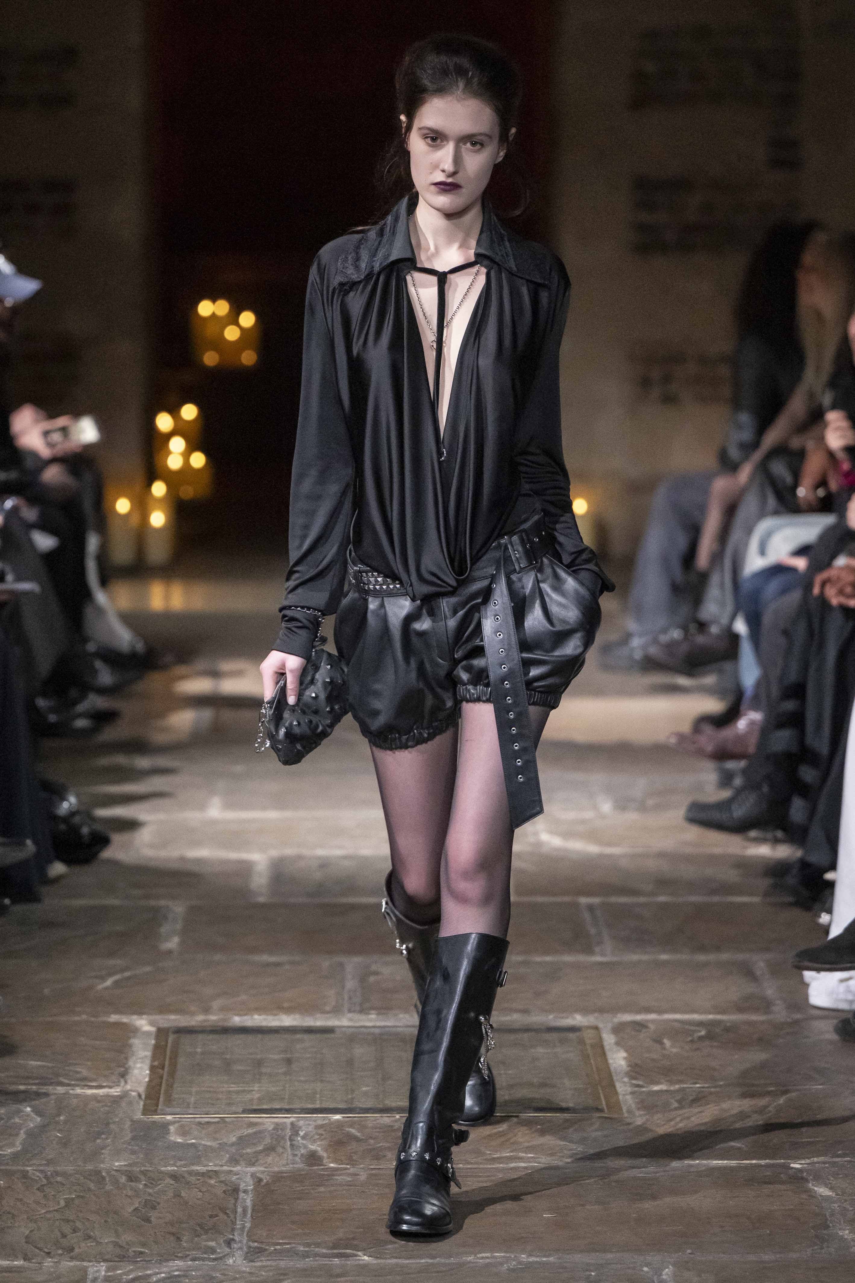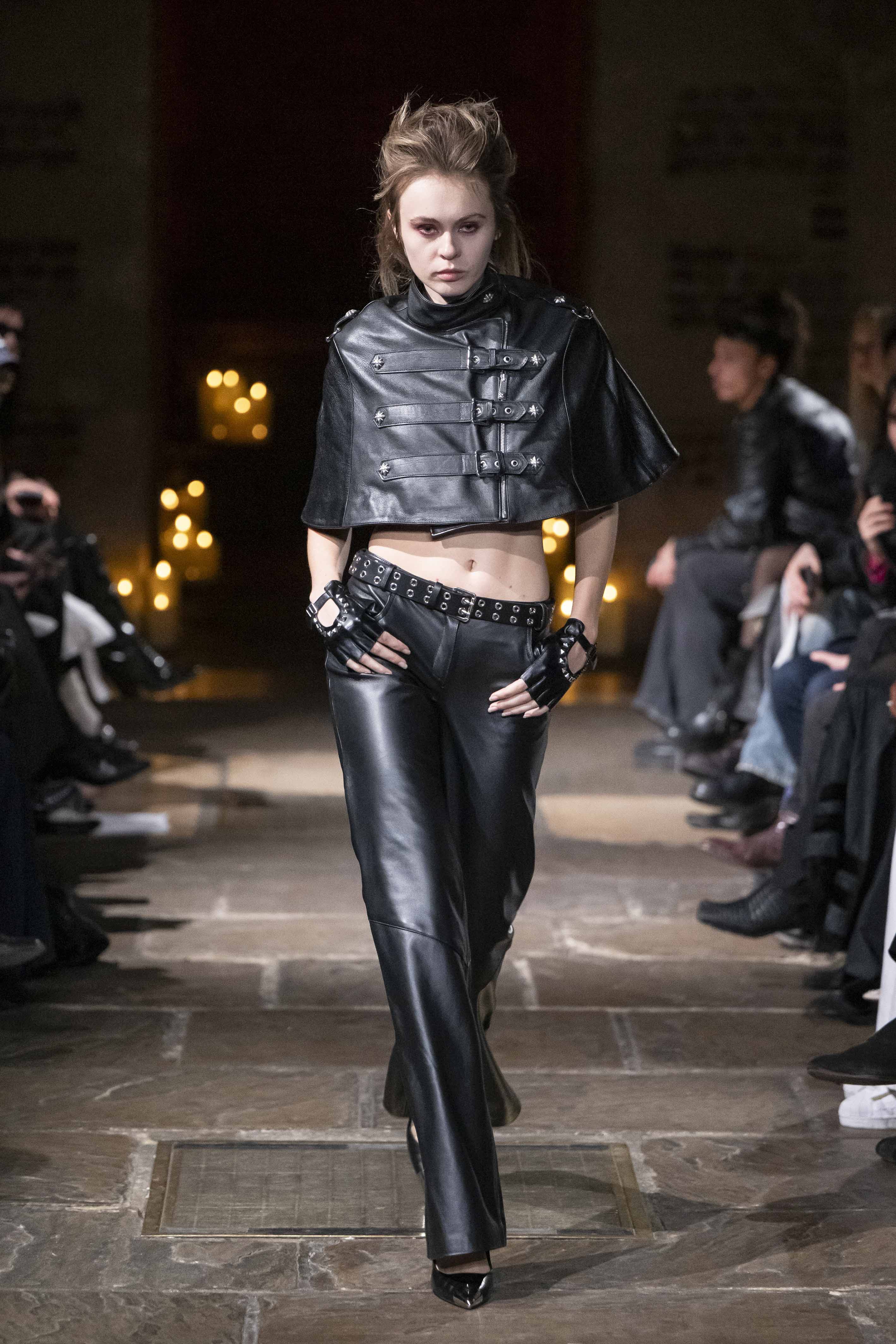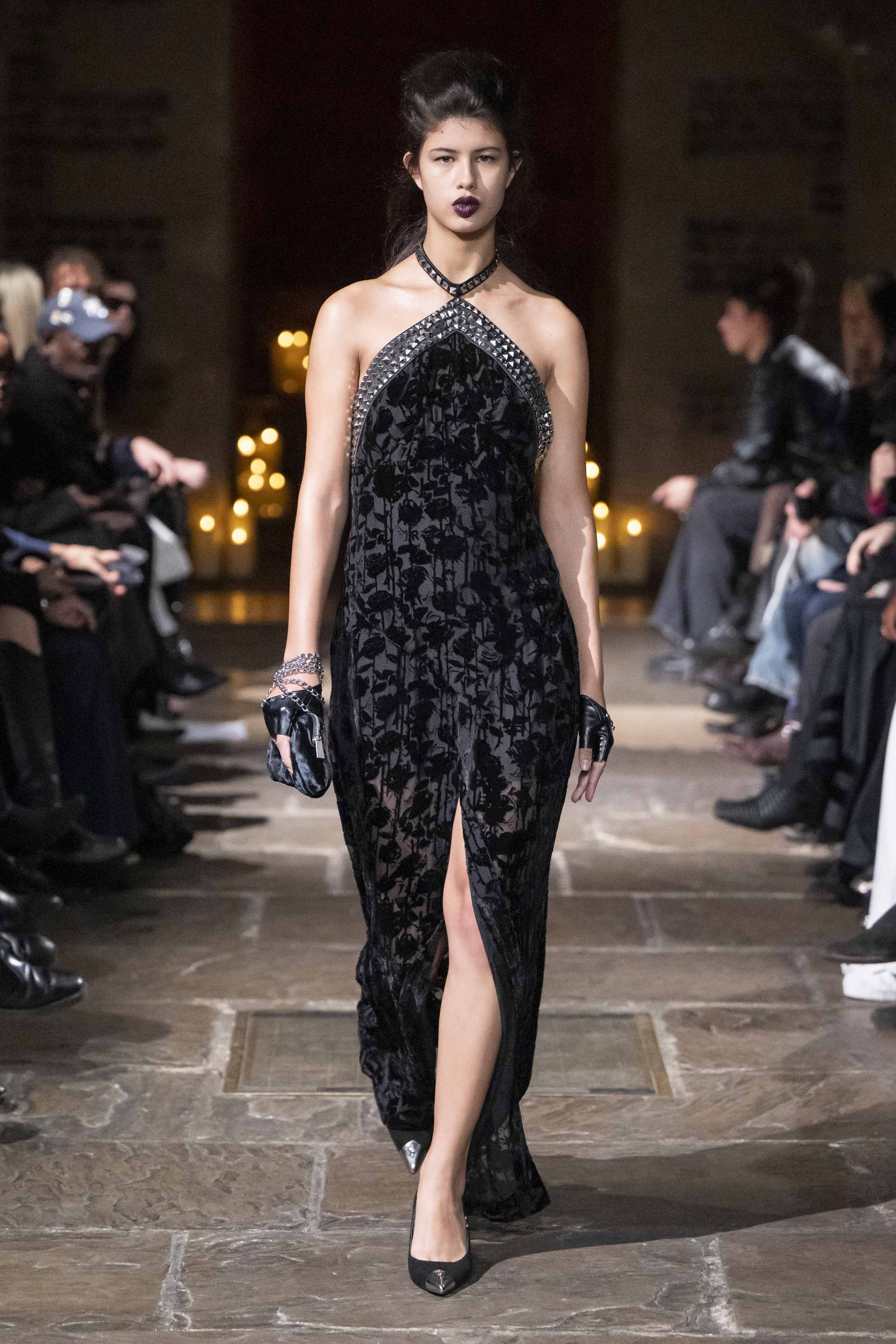 Construction becomes narrative. Architectural straps, lacing systems, and intelligent bondage references shape the body while questioning power and control. Chains meet fragile fabrics, raw edges resist polish, and dead roses and thistles emerge as emblems of beauty sharpened by survival.