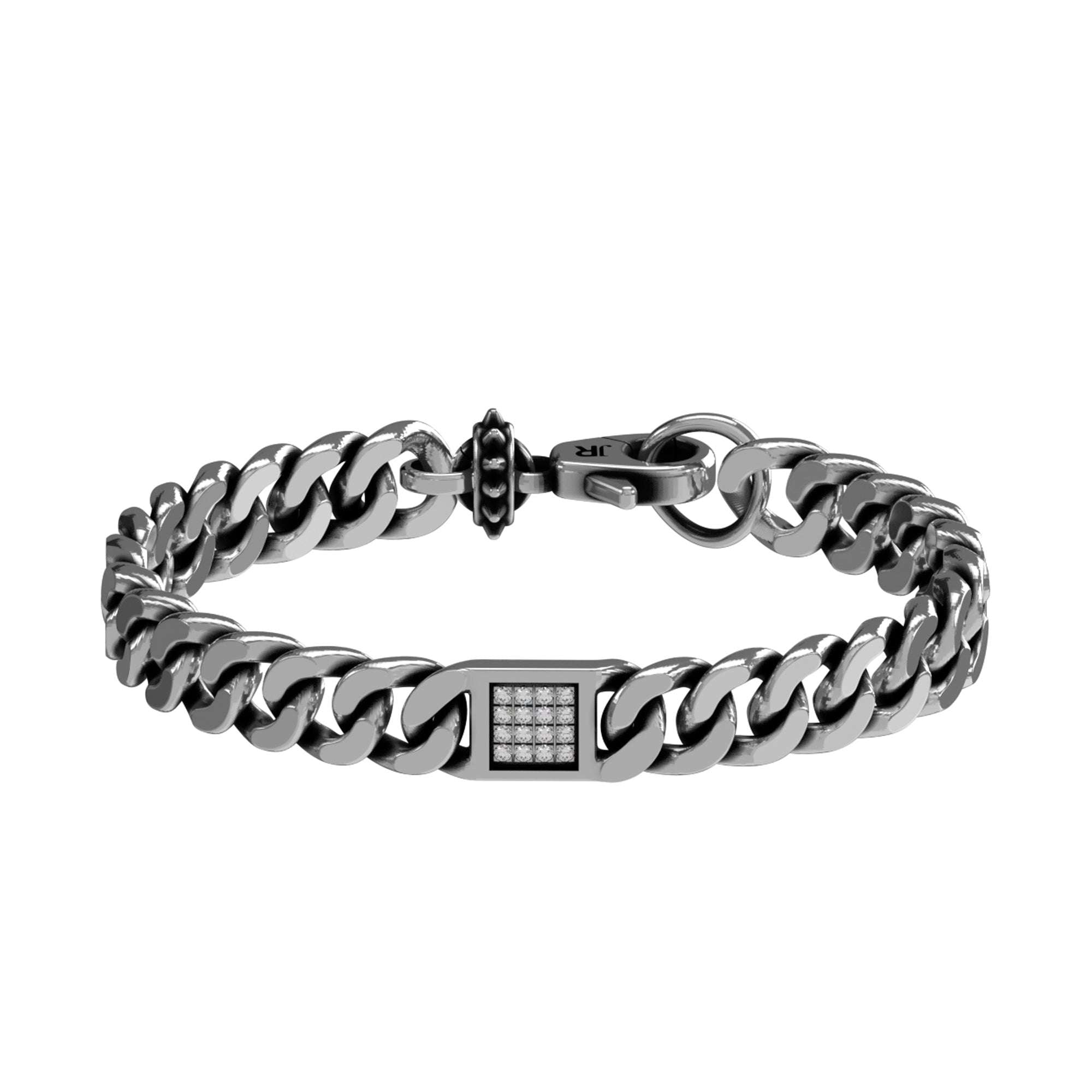 Questo bracciale dal design deciso si distingue per la sua maglia larga e il dettaglio centrale a pavé che aggiunge un tocco di luminosità. Perfetto per completare look casual o eleganti, unisce carattere e raffinatezza in un unico accessorio di tendenza.