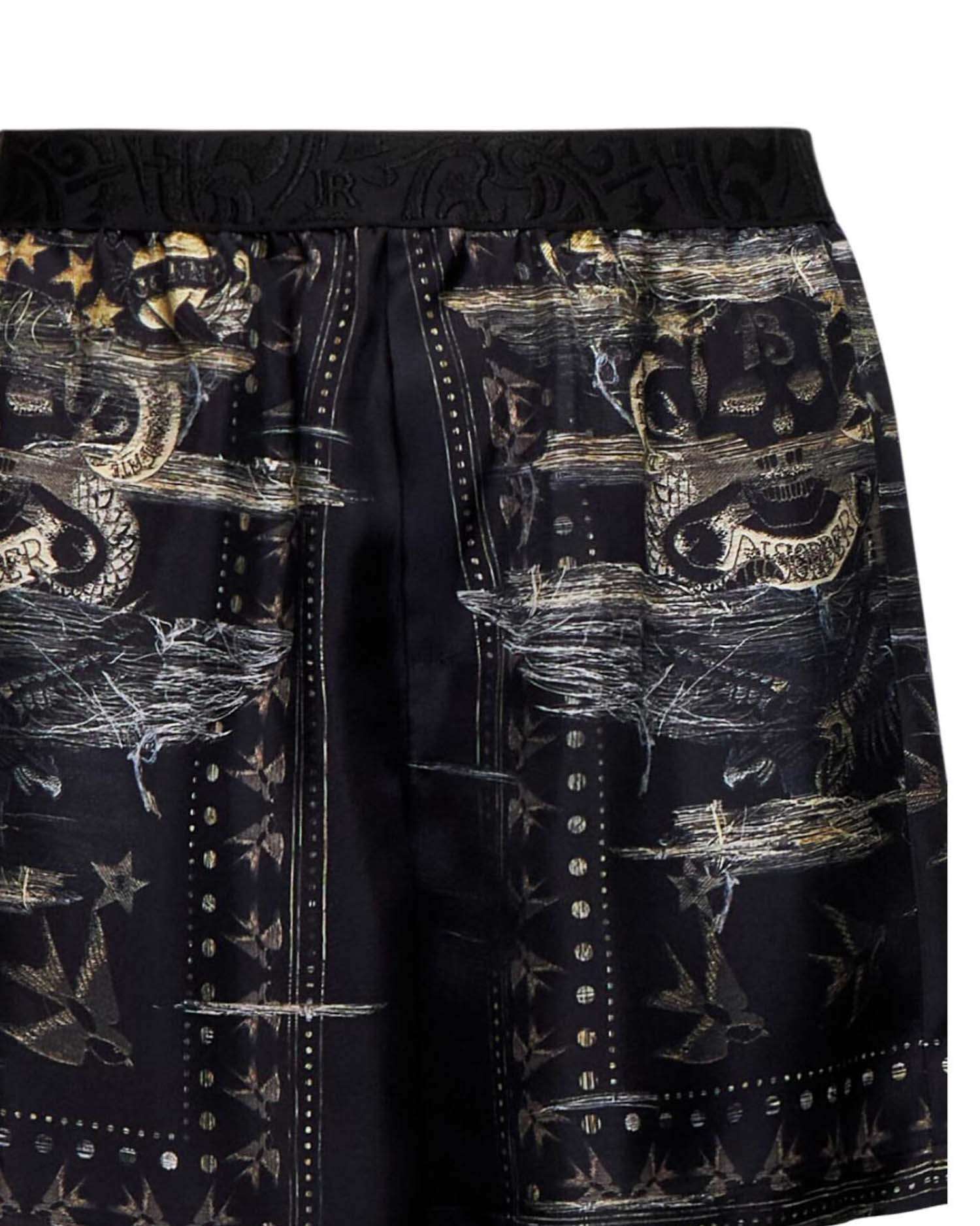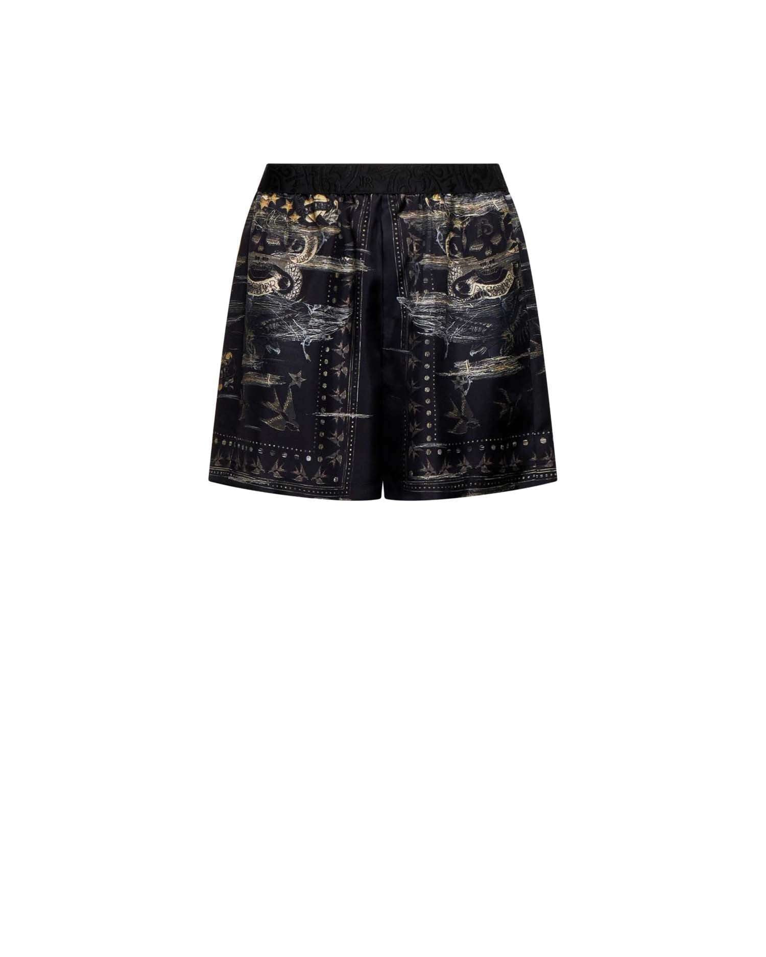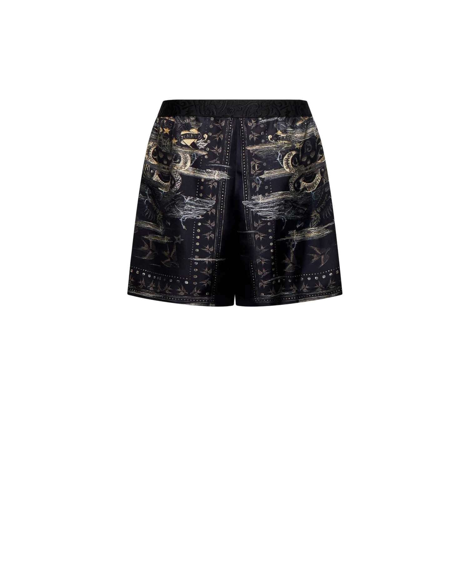Bermuda neri con stampa decorativa dal carattere distintivo, perfetti per aggiungere un tocco grafico e originale a look estivi o streetwear. La vita elasticizzata garantisce praticità e stile in ogni occasione.